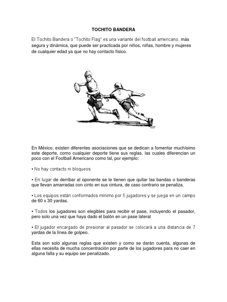 TOCHITO BANDERA El Tochito Bandera o Tochito Flag es una variante del football americano, ms segura y dinmica, que puede