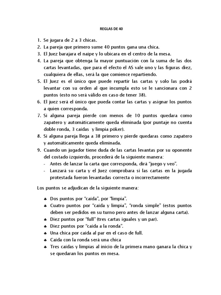1. Se jugara de 2 a 3 chicas. 2. La pareja que primero sume 40 puntos gana una chica. 3. El Juez barajara el naipe y lo ubicara en el centro de la mesa. 4. La pareja que obtenga la mayor puntuacin con la suma de las dos cartas levantadas, que para el efecto el AS vale uno y las figuras diez, cualquiera de ellas, ser la que comience repartiendo. 5. El Juez es el nico que puede repartir las cartas y solo las podr levantar con su orden al que incumpla esto se le sancionara con 2 puntos (esto no ser vlido en caso de tener 38). 6. El juez ser el nico que pueda contar las cartas y asignar los puntos a quien corresponda. 7. Si alguna pareja pierde con menos de 10 puntos quedara como zapatero y automticamente queda eliminada (por puntaje no cuenta doble ronda, 3 cadas y limpia pker). 8. Si alguna pareja llega a 38 primero y pierde quedaras como zapatero y automticamente queda eliminada. 9. Cuando un jugador tiene duda de las cartas levantas por su oponente del costado izquierdo, proceder de la siguiente manera: Antes de lanzar la carta que corresponda, dir juego y veo. Lanzar su carta y el Juez comprobara si las cartas en la jugada protestada fueron levantadas correcta o incorrectamente Los puntos se adjudican de la siguiente manera: Dos puntos por cada, por limpia. Cuatro puntos por cada y limpia, ronda simple (estos puntos deben ser pedidos en su turno pero antes de lanzar alguna carta). Diez puntos por full (tres cartas iguales y un par). Diez puntos por cada a la ronda. Una chica por cada al par en el caso de full. Cada con la ronda ser una chica Tres cadas y limpias al inicio de la primera mano ganara la chica y se quedaran los puntos en mesa.