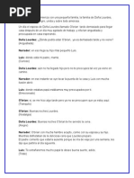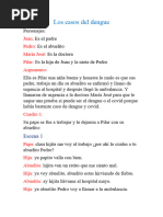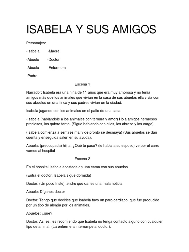 Personajes: -Isabela -Abuelo -Abuela -Padre Escena 1 Narrador: Isabela era una nia de 11 aos que era muy amorosa y no tena amigos ms que los animales que vivan en la casa de sus abuelos ella viva con sus abuelos en una finca y sus padres vivan en la ciudad. Isabela jugando con los animales en el patio de una casa. -Isabela:(hablndole a los animales con ternura y amor) Hola amigos hermosos preciosos, los quiero tanto. (Sigue hablando con ellos, los abraza y los carga). (Isabela comienza a sentirse mal y de pronto se desmaya) (Sus abuelos se dan cuenta y enseguida salen en su ayuda). Abuela: (preocupada) hijita, Qu te pas? (le habla a su esposo) ve por el carro vamos al hospital Escena 2 En el hospital Isabela acostada en una cama con sus abuelos. (Entra el doctor, Isabela sigue dormida) Doctor: (Un poco triste) tendr que darles una mala noticia. Abuelo: Dganos doctor Doctor: Tengo que decirles que Isabela tuvo un paro cardiaco, que fue producido por un tipo de alergia por los animales. Abuelos: qu? Doctor: As es, les recomiendo que Isabela no tenga contacto alguno con cualquier tipo de animal. (La enfermera interrumpe al doctor). -Madre -Doctor -Enfermera