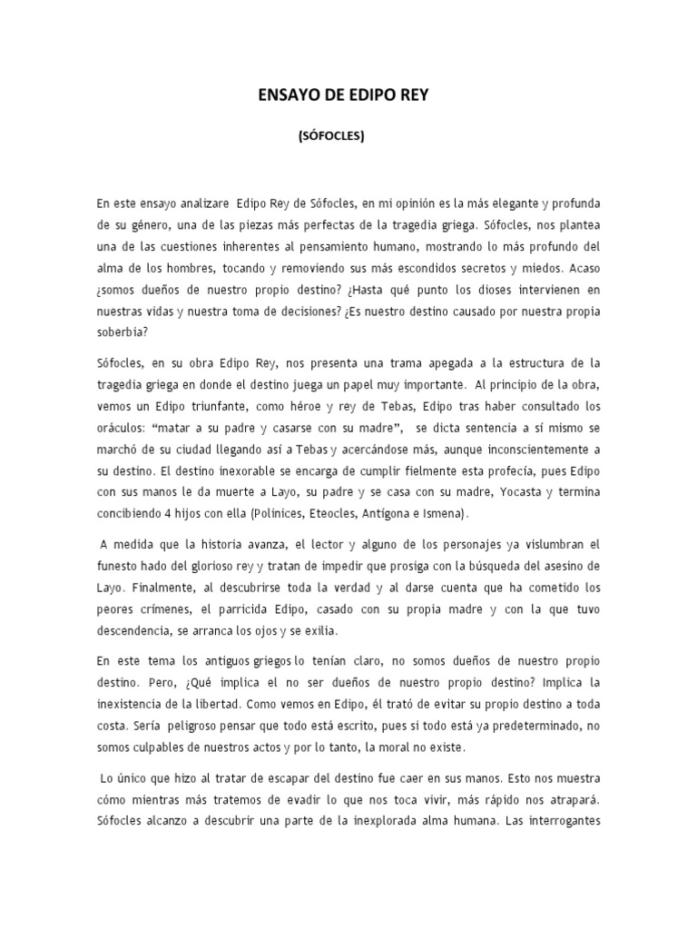 En este ensayo analizare Edipo Rey de Sfocles, en mi opinin es la ms elegante y profunda de su gnero, una de las piezas ms perfectas de la tragedia griega. Sfocles, nos plantea una de las cuestiones inherentes al pensamiento humano, mostrando lo ms profundo del alma de los hombres, tocando y removiendo sus ms escondidos secretos y miedos. Acaso somos dueos de nuestro propio destino? Hasta qu punto los dioses intervienen en nuestras vidas y nuestra toma de decisiones? Es nuestro destino causado por nuestra propia soberbia? Sfocles, en su obra Edipo Rey, nos presenta una trama apegada a la estructura de la tragedia griega en donde el destino juega un papel muy importante. Al principio de la obra, vemos un Edipo triunfante, como hroe y rey de Tebas, Edipo tras haber consultado los orculos: matar a su padre y casarse con su madre, se dicta sentencia a s mismo se march de su ciudad llegando as a Tebas y acercndose ms, aunque inconscientemente a su destino. El destino inexorable se encarga de cumplir fielmente esta profeca, pues Edipo con sus manos le da muerte a Layo, su padre y se casa con su madre, Yocasta y termina concibiendo 4 hijos con ella (Polinices, Eteocles, Antgona e Ismena). A medida que la historia avanza, el lector y alguno de los personajes ya vislumbran el funesto hado del glorioso rey y tratan de impedir que prosiga con la bsqueda del asesino de Layo. Finalmente, al descubrirse toda la verdad y al darse cuenta que ha cometido los peores crmenes, el parricida Edipo, casado con su propia madre y con la que tuvo descendencia, se arranca los ojos y se exilia. En este tema los antiguos griegos lo tenan claro, no somos dueos de nuestro propio destino. Pero, Qu implica el no ser dueos de nuestro propio destino? Implica la inexistencia de la libertad. Como vemos en Edipo, l trat de evitar su propio destino a toda costa. Sera peligroso pensar que todo est escrito, pues si todo est ya predeterminado, no somos culpables de nuestros actos y por lo tanto, la moral no existe. Lo nico que hizo al tratar de escapar del destino fue caer en sus manos. Esto nos muestra cmo mientras ms tratemos de evadir lo que nos toca vivir, ms rpido nos atrapar. Sfocles alcanzo a descubrir una parte de la inexplorada alma humana. Las interrogantes
