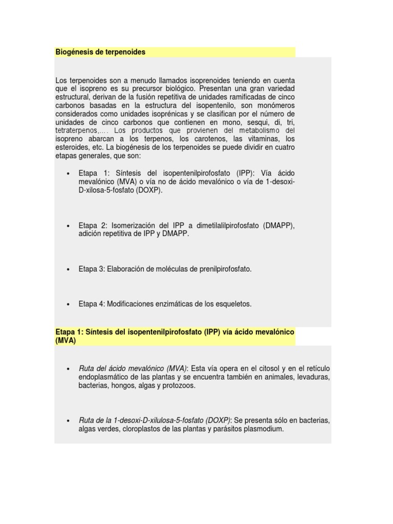 Etapa 1: Sntesis del isopentenilpirofosfato (IPP): Va cido mevalnico (MVA) o va no de cido mevalnico o va de 1-desoxiD-xilosa-5-fosfato (DOXP).