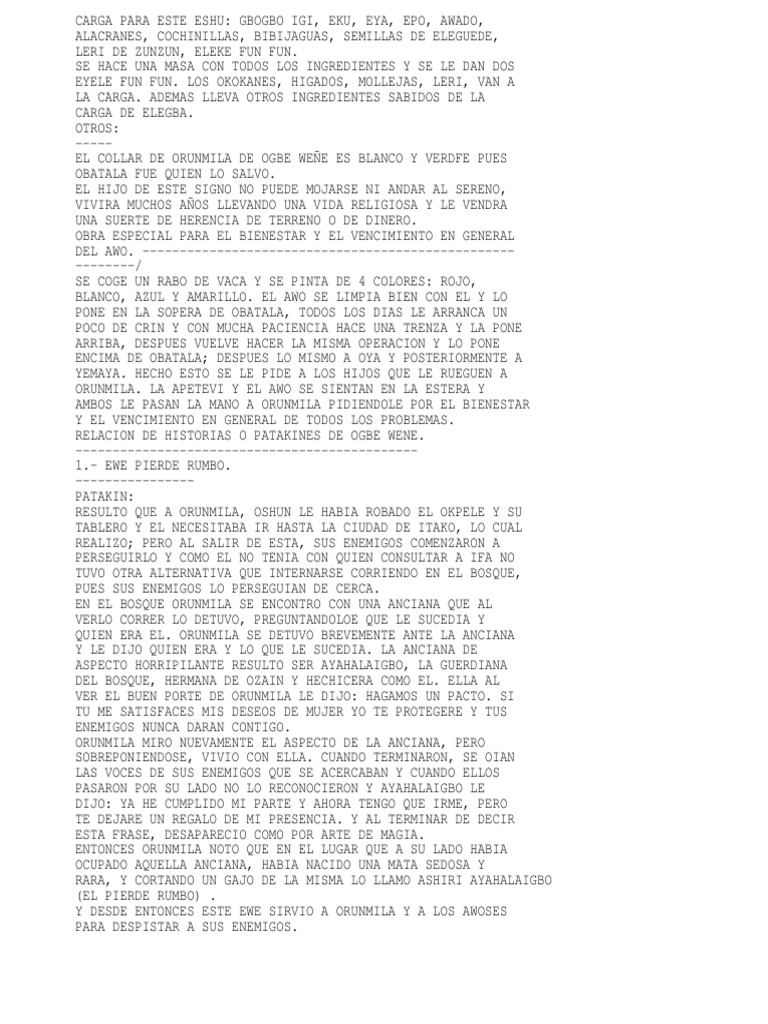 LERI DE ZUNZUN, ELEKE FUN FUN. SE HACE UNA MASA CON TODOS LOS INGREDIENTES Y SE LE DAN DOS EYELE FUN FUN. LOS OKOKANES, HIGADOS, MOLLEJAS, LERI, VAN A LA CARGA. ADEMAS LLEVA OTROS INGREDIENTES SABIDOS DE LA CARGA DE ELEGBA. OTROS: ----EL COLLAR DE ORUNMILA DE OGBE WEE ES BLANCO Y VERDFE PUES OBATALA FUE QUIEN LO SALVO. EL HIJO DE ESTE SIGNO NO PUEDE MOJARSE NI ANDAR AL SERENO, VIVIRA MUCHOS AOS LLEVANDO UNA VIDA RELIGIOSA Y LE VENDRA UNA SUERTE DE HERENCIA DE TERRENO O DE DINERO. OBRA ESPECIAL PARA EL BIENESTAR Y EL VENCIMIENTO EN GENERAL DEL AWO. ---------------------------------------------------------/ SE COGE UN RABO DE VACA Y SE PINTA DE 4 COLORES: ROJO, BLANCO, AZUL Y AMARILLO. EL AWO SE LIMPIA BIEN CON EL Y LO PONE EN LA SOPERA DE OBATALA, TODOS LOS DIAS LE ARRANCA UN POCO DE CRIN Y CON MUCHA PACIENCIA HACE UNA TRENZA Y LA PONE ARRIBA, DESPUES VUELVE HACER LA MISMA OPERACION Y LO PONE ENCIMA DE OBATALA; DESPUES LO MISMO A OYA Y POSTERIORMENTE A YEMAYA. HECHO ESTO SE LE PIDE A LOS HIJOS QUE LE RUEGUEN A ORUNMILA. LA APETEVI Y EL AWO SE SIENTAN EN LA ESTERA Y AMBOS LE PASAN LA MANO A ORUNMILA PIDIENDOLE POR EL BIENESTAR Y EL VENCIMIENTO EN GENERAL DE TODOS LOS PROBLEMAS. RELACION DE HISTORIAS O PATAKINES DE OGBE WENE. ---------------------------------------------1.- EWE PIERDE RUMBO. ---------------PATAKIN: RESULTO QUE A ORUNMILA, OSHUN LE HABIA ROBADO EL OKPELE Y SU TABLERO Y EL NECESITABA IR HASTA LA CIUDAD DE ITAKO, LO CUAL REALIZO; PERO AL SALIR DE ESTA, SUS ENEMIGOS COMENZARON A PERSEGUIRLO Y COMO EL NO TENIA CON QUIEN CONSULTAR A IFA NO TUVO OTRA ALTERNATIVA QUE INTERNARSE CORRIENDO EN EL BOSQUE, PUES SUS ENEMIGOS LO PERSEGUIAN DE CERCA. EN EL BOSQUE ORUNMILA SE ENCONTRO CON UNA ANCIANA QUE AL VERLO CORRER LO DETUVO, PREGUNTANDOLOE QUE LE SUCEDIA Y QUIEN ERA EL. ORUNMILA SE DETUVO BREVEMENTE ANTE LA ANCIANA Y LE DIJO QUIEN ERA Y LO QUE LE SUCEDIA. LA ANCIANA DE ASPECTO HORRIPILANTE RESULTO SER AYAHALAIGBO, LA GUERDIANA DEL BOSQUE, HERMANA DE OZAIN Y HECHICERA COMO EL. ELLA AL VER EL BUEN PORTE DE ORUNMILA LE DIJO: HAGAMOS UN PACTO. SI TU ME SATISFACES MIS DESEOS DE MUJER YO TE PROTEGERE Y TUS ENEMIGOS NUNCA DARAN CONTIGO. ORUNMILA MIRO NUEVAMENTE EL ASPECTO DE LA ANCIANA, PERO SOBREPONIENDOSE, VIVIO CON ELLA. CUANDO TERMINARON, SE OIAN LAS VOCES DE SUS ENEMIGOS QUE SE ACERCABAN Y CUANDO ELLOS PASARON POR SU LADO NO LO RECONOCIERON Y AYAHALAIGBO LE DIJO: YA HE CUMPLIDO MI PARTE Y AHORA TENGO QUE IRME, PERO TE DEJARE UN REGALO DE MI PRESENCIA. Y AL TERMINAR DE DECIR ESTA FRASE, DESAPARECIO COMO POR ARTE DE MAGIA. ENTONCES ORUNMILA NOTO QUE EN EL LUGAR QUE A SU LADO HABIA OCUPADO AQUELLA ANCIANA, HABIA NACIDO UNA MATA SEDOSA Y RARA, Y CORTANDO UN GAJO DE LA MISMA LO LLAMO ASHIRI AYAHALAIGBO (EL PIERDE RUMBO) . Y DESDE ENTONCES ESTE EWE SIRVIO A ORUNMILA Y A LOS AWOSES PARA DESPISTAR A SUS ENEMIGOS.