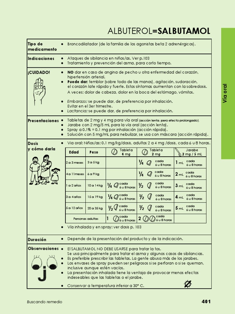 Jarabe con 2 mg/5 mL para la va oral (accin lenta). Spray a 0.1% = 0.1 mg por inhalacin (accin rpida). Solucin con 5 mg/mL para nebulizar, se usa con mscara (accin rpida). Via oral: Nios/as: 0.1 mg/kg/dosis, adultos 2 a 4 mg /dosis, cada 6 u 8 horas. Edad