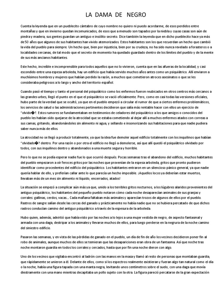 Cuenta la leyenda que en un pueblecito cntabro de cuyo nombre no quiero ni puedo acordarme, de esos perdidos entre montaas y que en invierno quedan incomunicados, de esos que a menudo son tapados por la niebla y cuyas casas son an de piedra y madera, sus gentes guardan un antiguo e inslito secreto. Dice tambin la leyenda que en dicho pueblecito hace ya ms de 50 aos que algunos de sus habitantes han vivido atemorizados. Estos habitantes son los que recuerdan un hecho que cambi la vida del pueblo para siempre. Un hecho que, bien por injusticia, bien por su crudeza, no ha sido nunca revelado a forasteros o a localidades cercanas, de tal modo que el secreto de momento ha quedado guardado dentro de los lmites del pueblo y de la mente de sus ms ancianos habitantes. Este hecho, increble e incomprensible para todos aquellos que no lo vivieron, cuenta que en las afueras de la localidad, y casi escondido entre una espesa arboleda, hay un edificio que haba servido muchos aos antes como un psiquitrico. All enviaron a muchsimos hombres y mujeres que haban perdido la razn, a muchos que cometieron atroces asesinatos o que se les consideraba peligrosos a lo largo y ancho del territorio espaol. Cuando pas el tiempo y tanto el personal del psiquitrico como los enfermos fueron reubicados en otros centros ms cercanos a las grandes urbes, lleg el punto en el que el psiquitrico se vaci oficialmente. Pero, como en casi todas las versiones oficiales, hubo parte de la verdad que se ocult, ya que en el pueblo empez a circular el rumor de que a ciertos enfermos problemticos, los servicios de salud o las administraciones pertinentes decidieron que sala ms rentable hacer con ellos un ejercicio de olvido?. Estos rumores se fundamentaban en testimonios de celadores del psiquitrico a los que amigos o conocidos del pueblo les haban odo quejarse de la atrocidad que se estaba cometiendo al dejar all a muchos enfermos atados con correas a sus camas, gritando, abandonndoles sin alimento ni agua, y sellando e insonorizando sus habitaciones para que nadie pudiera saber nunca ms de ellos. La atrocidad no se lleg a producir totalmente, ya que la idea fue demoler aquel edificio totalmente con los inquilinos que haban olvidado? dentro. Por una razn o por otra el edificio no lleg a demolerse, as que all qued el psiquitrico olvidado por todos, con sus inquilinos dentro y abandonados a una muerte segura y horrible. Pero lo que no se poda esperar nadie fue lo que ocurri despus. Pocas semanas tras el abandono del edificio, muchos habitantes del pueblo empezaron a or feroces gritos por las noches que provenan de la espesa arboleda, gritos que pronto pudieron identificar como procedentes del edificio del psiquitrico. Los habitantes entraron en un silencioso pnico general, ya que nadie quera hablar de ello, y preferan callar ante lo que pareca un hecho imposible. Aquellos locos ya deberan estar muertos, llevaban ms de un mes sin alimento ni lquido, encerrados, atados! La situacin se empez a complicar an ms ya que, unido a los terribles gritos nocturnos, a los lgubres alaridos provenientes del antiguo psiquitrico, los habitantes del pequeo pueblo notaron cmo cada noche desaparecan animales de sus granjas y corrales: gallinas, cerdos, vacas Cada maana faltaban ms animales y aparecan trozos de algunos de ellos por el pueblo. Rastros de sangre salan desde las cercas del ganado y prcticamente no haba nadie que no se hubiera percatado de que dichos rastros conducan camino del antiguo psiquitrico a travs de la espesura de la arboleda. Hubo quien, adems, advirti que haba visto por las noches a lo lejos a una mujer vestida de negro, de aspecto fantasmal y armada con una daga, destripar a los animales y llevarse muchos de ellos, para luego perderse en la negrura de la noche camino del siniestro edificio. Pasaron las semanas, y en vista de las prdidas de ganado en el pueblo, un da de fin de ao los vecinos decidieron poner fin al robo de animales, aunque muchos de ellos se temieran que las desapariciones eran obra de un fantasma. As que noche tras noche montaron guardia en todos los corrales y cercados, hasta que por fin una noche dieron con algo. Uno de los vecinos que vigilaba encontr al ladrn con las manos en la masa y llam al resto de personas que montaban guardia, que rpidamente se unieron a l. Delante de ellos, como si los espectros realmente existieran y fueran algo tan natural como el da o la noche, haba una figura tapada con una manta negra, levitando unos centmetros sobre el suelo, con una daga que mova diestramente con una mano mientras decapitaba un pollo sujeto con la otra. La figura pareci percatarse de la gran expectacin
