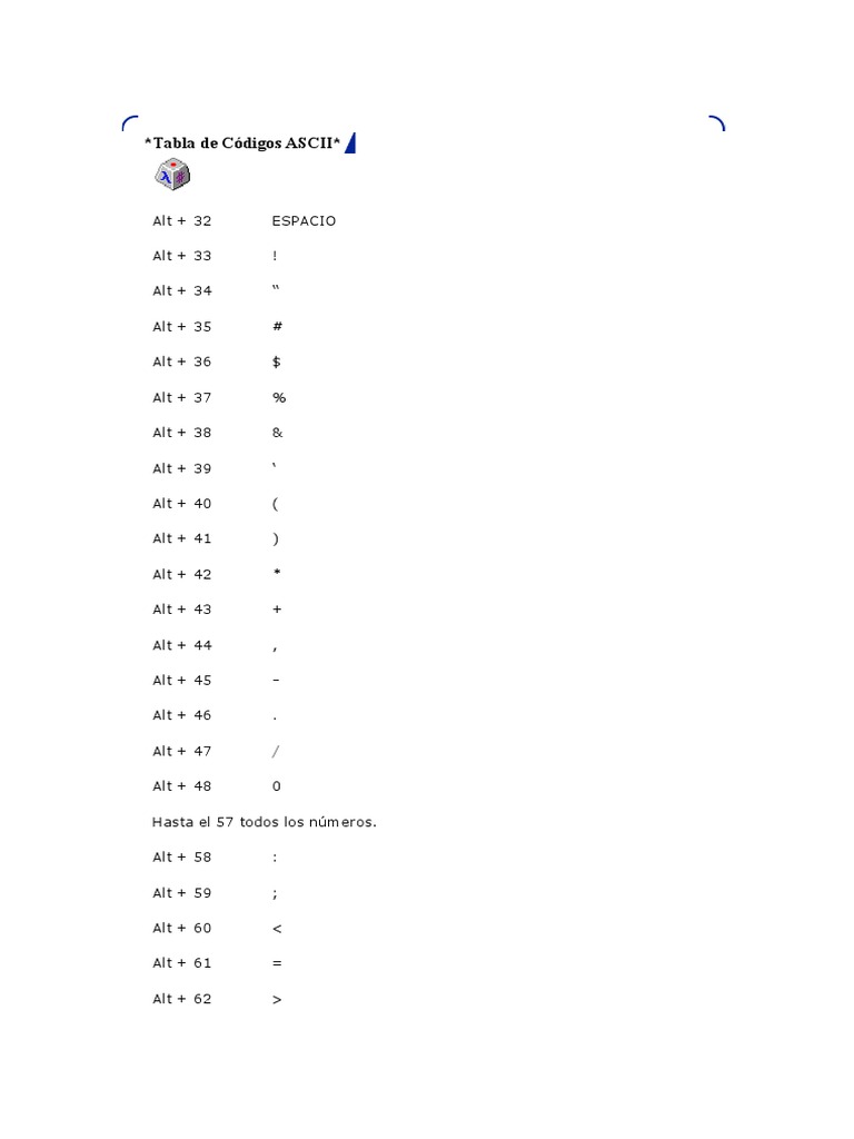 Hasta el 122 todas las letras minsculas. Alt + 123 Alt + 124 Alt + 125 Alt + 126 Alt + 127 Alt + 128 Alt + 129 Alt + 130 Alt + 131 Alt + 132 Alt + 133 Alt + 134 Alt + 135 Alt + 136 { [ } ~ &