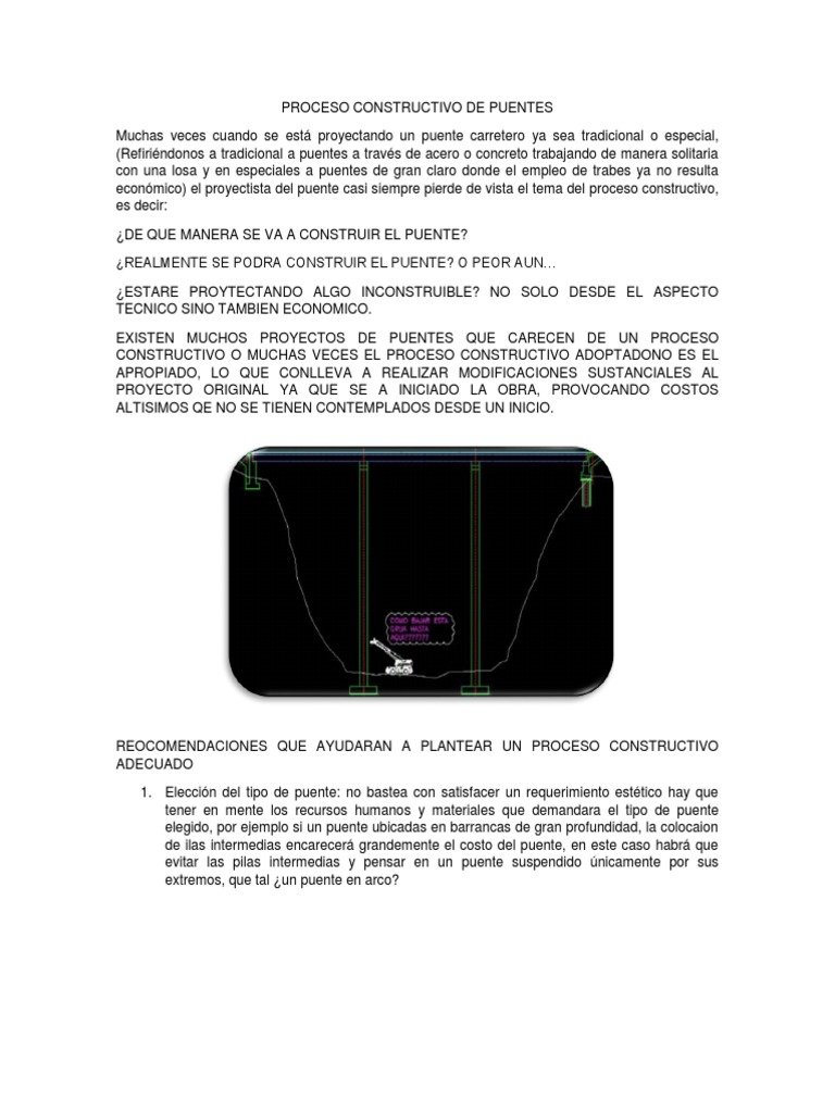 a puentes a travs de acero o concreto trabajando de manera solitaria con una losa y en especiales a puentes de gran claro donde el empleo de trabes ya no resulta econmico) el proyectista del puente casi siempre pierde de vista el tema del proceso constructivo, es decir: DE QUE MANERA SE VA A CONSTRUIR EL PUENTE? REALMENTE SE PODRA CONSTRUIR EL PUENTE? O PEOR AUN ESTARE PROYTECTANDO ALGO INCONSTRUIBLE? NO SOLO DESDE EL ASPECTO TECNICO SINO TAMBIEN ECONOMICO. EXISTEN MUCHOS PROYECTOS DE PUENTES QUE CARECEN DE UN PROCESO CONSTRUCTIVO O MUCHAS VECES EL PROCESO CONSTRUCTIVO ADOPTADONO ES EL APROPIADO, LO QUE CONLLEVA A REALIZAR MODIFICACIONES SUSTANCIALES AL PROYECTO ORIGINAL YA QUE SE A INICIADO LA OBRA, PROVOCANDO COSTOS ALTISIMOS QE NO SE TIENEN CONTEMPLADOS DESDE UN INICIO.