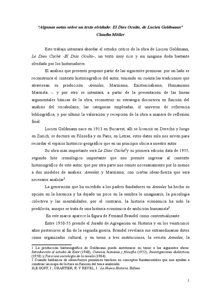 el estudio crtico de la obra de Lucien Goldmann, Le Dieu Cach -El Dios Oculto-, un texto muy rico y sin ninguna duda bastante olvidado por los historiadores. El anlisis que presento propone partir de las siguientes premisas: por un lado se reconstruir el contexto historiogrfico del autor, teniendo en cuenta las tradiciones que atraviesan su produccin -Annales, Marxismo, Existencialismo, Humanismo Marxista...-; y por otro se intentar, a partir de la presentacin de las lneas argumentales bsicas de la obra, reconstruir su estrategia discursiva en funcin del anlisis del vocabulario, las categoras empleadas, el universo de referencia bibliogrfica, y por ltimo la valoracin y recepcin de la obra a manera de reflexin final. Lucien Goldmann nace en 1913 en Bucarest, all se licenci en Derecho y luego en Zurich, se doctor en Filosofa y en Paris, en Letras; estos datos slo nos sirven para recordar el espacio histrico-geogrfico que en un principio ubica a nuestro autor. Su obra ms importante ser Le Dieu Cach1y su primera edicin data de 1955, segundo hito cronolgico importante que nos permite ingresar al contexto historiogrfico de este autor, que por otra parte nos remite necesariamente por lo menos a dos modelos de anlisis: Annales y Marxismo, con ciertas ideas-fuerza que ser necesario analizar2. La generacin que ha sucedido a los padres fundadores en Annales ha hecho su opcin en la herencia y ha dejado un poco en la sombra lo imaginario, la psicologa colectiva y las mentalidades; por el contrario, la historia econmica ha sido la predilecta, aunque se trata de una historia econmica de ambicin humanista3. En este marco aparece la figura de Fernand Braudel como contextualizante. Entre 1950-55 preside el Jurado de Agregacin en Historia y en los veinticinco aos posteriores al fin de la segunda guerra, Braudel revelara sus extraordinarias dotes como organizador cultural, y en torno a tres instituciones, la revista Annales, la