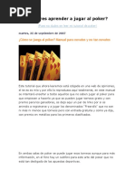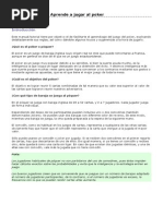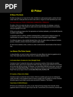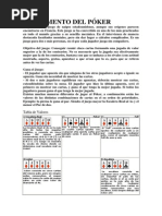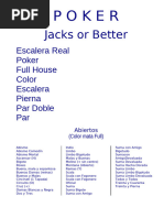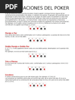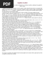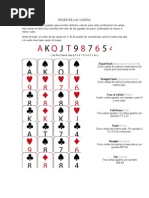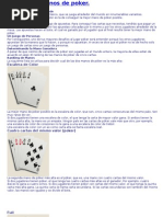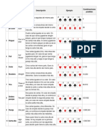 No es necesario que la jugada sea efectivamente mejor que la de los contrarios, bastar con que se induzca a los rivales (con actitud mostrada, aspecto, gestos, apuestas) a que crean que lo es, para que se retiren antes de ver las cartas. Gana el Juego: - El jugador que apuesta sin que ninguno de los otros jugadores acepte o iguale su apuesta. Gana sin necesidad de mostrar las cartas. - Si dos o ms jugadores equilibran sus apuestas, debern mostrar sus cartas, extendindolas sobre la mesa. El jugador que hizo la ltima apuesta, ser el primero en mostrar sus cartas, y gana el que tenga la mejor jugada. Si todos los jugadores pasan gana el que tenga la mejor jugada. Existen muchas maneras diferentes de jugar al Poker, a continuacin estn los valores de las distintas combinaciones de cartas en el su orden de prioridades. Ejemplo: la pierna le gana al par. Siendo el juego mayor la Escalera Real al As y el menor el Par de dos.