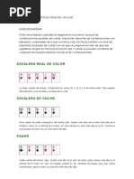 La escalera consiste en cualquier cinco cartas en orden, sin importar el palo de las cartas, donde si el as est por arriba es la ms alta de las escaleras (#). Cualquier combinacion de cinco cartas en orden consecutivo son una escalera. Est simpre debajo del Color. (#)