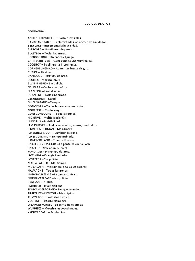 ad. BIGSCORE 10 millones de puntos. BLASTBOY Todas las armas. BOOOOORING Ralentiza el juego. CHITTYCHITTYBB Volar cuando vas muy rpido. COOLBOY Tu dinero se incrementa. CORNERSLIKEMAD Aumentar fuerza de giro. CUTIE1 99 vidas. DANISGOD 200,000 dolares. DESIRES Mximo nivel. ELVIS IS HERE Sin polica. FISHFLAP Coches pequeos. FLAMEON Lanzallamas. FORALLGT Todas las armas. GESUNDHEIT Salud. GIVEUSATANK Tanque. GODOFGTA Todas las armas y municin. GOREFEST Modo sangre. GUNSGUNSGUNS Todas las armas. HIGHFIVE Multiplicador 5x. HUNSRUS Invisibilidad. IAMASUCKER Todos los niveles, armas, modo dios. IFIWEREARICHMAN Mas dinero. ILIKEDRESSINGUP Cambiar de skins. ILIKESCOTLAND Tiempo nublado. ILOVESCOTLAND Tiempo lluvioso. ITSALLGOINGMAAAD La gente se vuelve loca. ITSALLUP Seleccion de nivel. JAMDAVEJ 9,999,990 dolares. LIVELONG Energia ilimitada. LOSEFEDS Sin policia. MADWEATHER Mal tiempo. MUCHCASH Mas dinero o 500,000 dolares. NAVARONE Todas las armas. NOBODYLIKESME La gente contra ti. NOPOLICEPLEASE No polica. PEASOUP Niebla. RSJABBER Invencibilidad. SKINCANCERFORME Tiempo soleado. TIMEFLIESWHENYOU Mas rpido. TUMYFROG Todos los niveles. VOLTEST Pistola relmpago. WEAPONSFORALL La gente tiene armas. WUGGLES Muestra las coordinadas. YAKUZADEATH Modo dios.