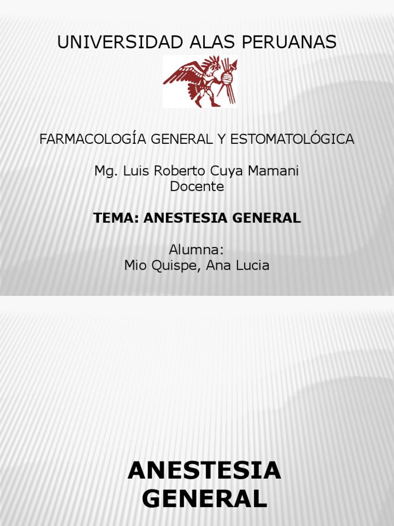 FARMACOLOGA GENERAL Y ESTOMATOLGICA Mg. Luis Roberto Cuya Mamani Docente TEMA: ANESTESIA GENERAL Alumna: Mio Quispe, Ana Lucia