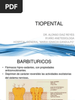BARBITRICOS: Tiopental Acciones farmacolgicas Alcanza concentraciones en el cerebro que producen una intensa accin depresora y anestesia; aparece a los 10-20 seg. y dura unos 20-30 minutos . La profundidad de la anestesia y la depresin de las diversas funciones es proporcional a la dosis. Si la depresin no es profunda, pueden aparecer salivacin, broncoespasmo, en especial en respuesta a estmulos qumicos o mecnicos.