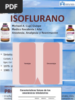 Caractersticas farmacocinticas Halotano: El 60-80 % se elimina por pulmn en las primeras 24 horas, metabolizacin heptica (15%) Enflurano: Se metaboliza en el 2-5 % Isoflurano: Se metaboliza en solo el 0.2 % Desflurano: Se metaboliza slo el 0,02 %. Sevoflurano: El 3 % se transforma hexofluoroisopropanol.