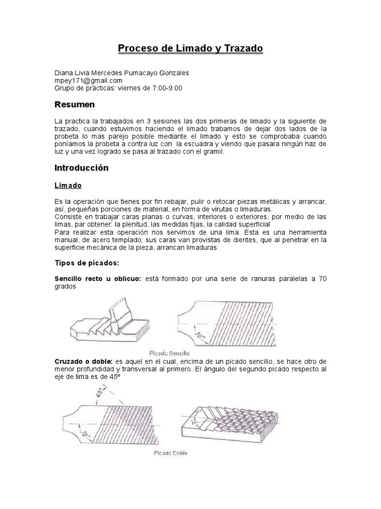 *s indispensa"le limpiar la lima% peso (ue las limas sucias dan super,icies rayadas. La carda de"e moverse tan solo en direcci+n de la picadura superior. Las virutas (ue se ad&ieren en limas pe(ue-as se limpian con una lamina de lat+n o de co"re Despu7s de terminar con el proceso de limado se lleva la pro"eta al gramil% y se coloca como "ase una de las partes limadas despu7s se a#usta la cuc&illa del gramil a la medida en la (ue se de"e trazar. *#erciendo una presi+n en el gramil se &ace el trazado 9 despu7s en cada punto donde se interceptan las l'neas se ara una pe(ue-a per,oraci+n con el cincel (ue sern las gu'as para realizar las per,oraciones