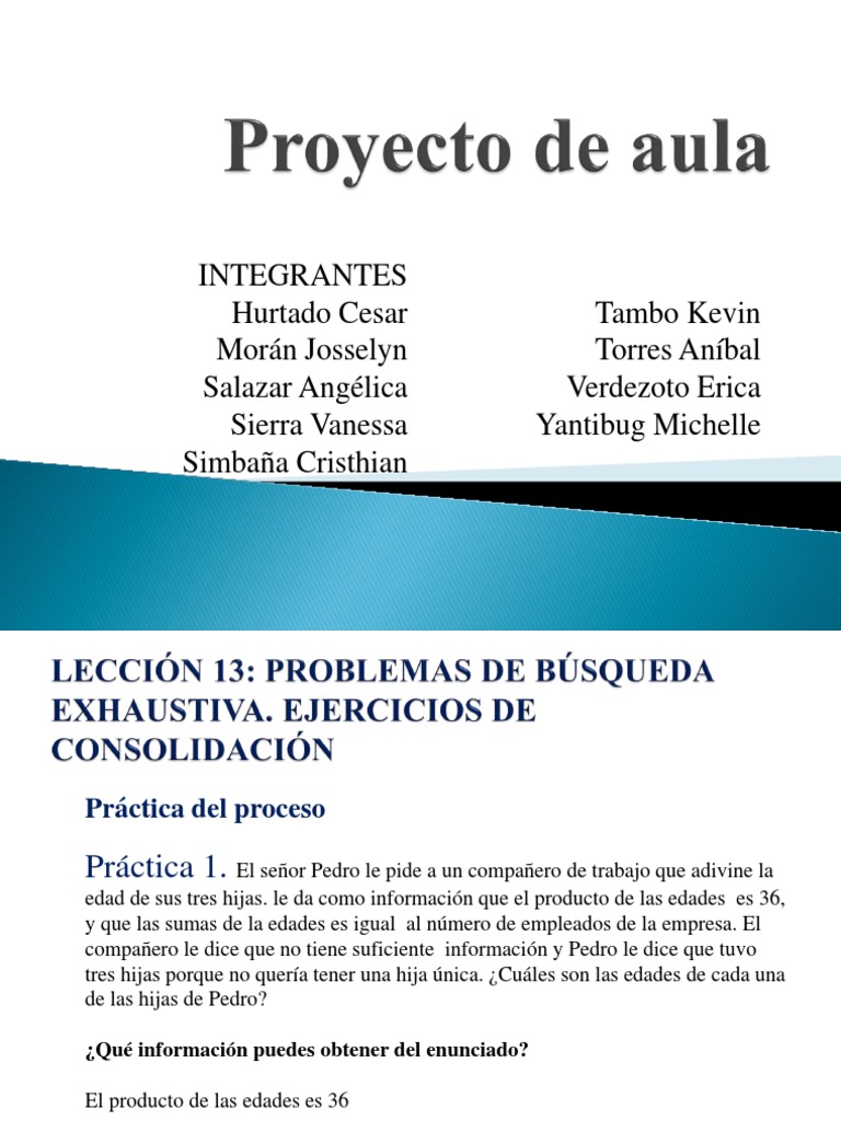 edad de sus tres hijas. le da como informacin que el producto de las edades es 36, y que las sumas de la edades es igual al nmero de empleados de la empresa. El compaero le dice que no tiene suficiente informacin y Pedro le dice que tuvo tres hijas porque no quera tener una hija nica. Cules son las edades de cada una de las hijas de Pedro? Qu informacin puedes obtener del enunciado? El producto de las edades es 36