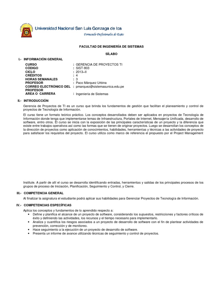 - INFORMACIN GENERAL CURSO CDIGO CICLO CRDITOS HORAS SEMANALES PROFESOR CORREO ELECTRNICO DEL PROFESOR REA O CARRERA II.- INTRODUCCIN Gerencia de Proyectos de TI es un curso que brinda los fundamentos de gestin que facilitan el planeamiento y control de proyectos de Tecnologa de Informacin. El curso tiene un formato terico prctico. Los conceptos desarrollados deben ser aplicados en proyectos de Tecnologa de Informacin donde tenga que implementarse temas de Infraestructura, Portales de Internet, Mensajera Unificada, desarrollo de software, entro otros. El curso se inicia con la exposicin de las principales caractersticas de un proyecto y la diferencia que existe entre trabajos operativos as como las formas que se tienen de originar proyectos. Luego se desarrollan los conceptos de la direccin de proyectos como aplicacin de conocimientos, habilidades, herramientas y tcnicas a las actividades de proyecto para satisfacer los requisitos del proyecto. El curso utiliza como marco de referencia el propuesto por el Project Management : : : : : : : GERENCIA DE PROYECTOS TI SIST-803 2013II 4 3 Paco Mrquez Urbina pmarquez@sistemasunica.edu.pe