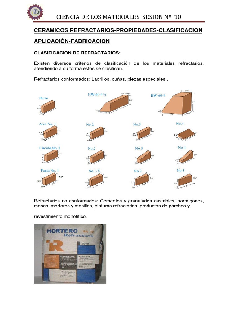 TIPOS DE REFRACTARIO Los refractarios se dividen en cuatro grupos: cidos, bsicos, neutros y especiales en base a su comportamiento qumico. Refractarios cidos: Incluyen las Arcilla de slice, de almina y refractarios de arcilla. La slice pura a veces se utiliza para contener metal lquido. Los refractarios de arcilla por lo general son relativamente dbiles, pero poco costosos. Contenidos de almina por arriba de aproximadamente 50% constituyen los refractarios de alta almina. Refractarios Bsicos: Varios refractarios se basan en el MgO (magnesia o periclasa). El MgO puro tiene un punto de fusin alto, buena refractariedad, buena resistencia al ataque por los entornos que a menudo se encuentran en los procesos de fabricacin de acero. Tpicamente, los refractarios bsicos son ms costosos que los refractarios cidos. Refractarios Neutros: Normalmente incluyen la cromita y la magnesita, pueden ser utilizados para separar refractarios cidos de los bsicos, impidiendo que uno ataque al otro. Refractarios Especiales: El carbono, El grafito, es utilizado en muchas aplicaciones refractarias, particularmente cuando operan en atmsfera no oxidante. Estos materiales refractarios incluyen la zirconia (ZrO2), el zircn (ZrO2.SiO2) y una diversidad de nitruros, carburos y boruros. Ladrillos refractarios Son utilizados para revestir parrillas, calderas, ollas de aceracin, hornos rotatorios de cementeras, etc., los cuales deben de estar pegados con tierra refractaria, estos se pueden adherir con firmeza en la tierra si se utiliza un poco de cemento, en donde el resultado de esta mezcla parecer como un barro.