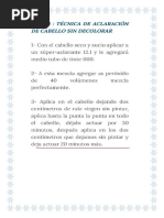TECNICA HIGIENICA Con esta tcnica, el champ se aplica en el cabello hmedo, a fin de que se emulsione con la suciedad y lograr una cabellera completamente limpia. Se recomienda ANTES DE REALIZAR UN PERMANENTE ANTES DE REALIZAR UN TRATAMIENTO HIDRATANTE. PASO A SEGUIR. PRIEMER PASO: Preparar al cliente con una bata adecuada, una toalla y una cuellera impermeable, de un color preferentemente claro. SEGUNDO PASO: Sentar al cliente en el rea de lavabo para comenzar a dar champ. TERCER PASO: Aplicar el champ con ambas manos. CUARTO PASO: Enjuagar. QUINTO PASO: Aplicar de nuevo champ con ambas manos, tratando de emulsionar y hacer subir la espuma hacia la parte frontal de la cabeza. SEXTO PASO: Dejar reposar durante dos o tres minutos. SEPTIMO PASO: Enjuagar el cabello a profundidad, hasta eliminar toda la espuma. OCTAVO PASO: Escribir el cabello con las manos y secar con la toalla.