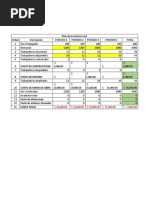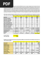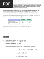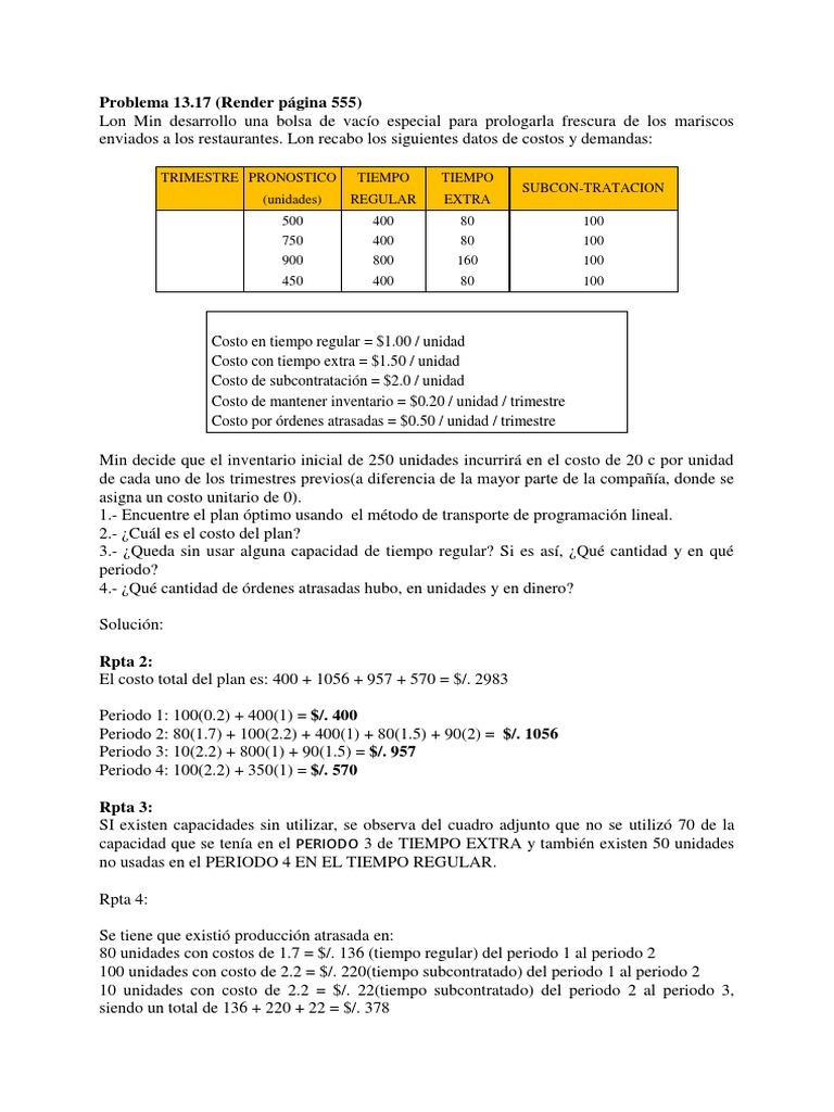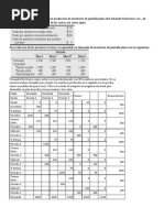 Min decide que el inventario inicial de 250 unidades incurrir en el costo de 20 c por unidad de cada uno de los trimestres previos(a diferencia de la mayor parte de la compaa, donde se asigna un costo unitario de 0). 1.- Encuentre el plan ptimo usando el mtodo de transporte de programacin lineal. 2.- Cul es el costo del plan? 3.- Queda sin usar alguna capacidad de tiempo regular? Si es as, Qu cantidad y en qu periodo? 4.- Qu cantidad de rdenes atrasadas hubo, en unidades y en dinero? Solucin: Rpta 2: El costo total del plan es: 400 + 1056 + 957 + 570 = $/. 2983 Periodo 1: 100(0.2) + 400(1) = $/. 400 Periodo 2: 80(1.7) + 100(2.2) + 400(1) + 80(1.5) + 90(2) = $/. 1056 Periodo 3: 10(2.2) + 800(1) + 90(1.5) = $/. 957 Periodo 4: 100(2.2) + 350(1) = $/. 570 Rpta 3: SI existen capacidades sin utilizar, se observa del cuadro adjunto que no se utiliz 70 de la capacidad que se tena en el PERIODO 3 de TIEMPO EXTRA y tambin existen 50 unidades no usadas en el PERIODO 4 EN EL TIEMPO REGULAR. Rpta 4: Se tiene que existi produccin atrasada en: 80 unidades con costos de 1.7 = $/. 136 (tiempo regular) del periodo 1 al periodo 2 100 unidades con costo de 2.2 = $/. 220(tiempo subcontratado) del periodo 1 al periodo 2 10 unidades con costo de 2.2 = $/. 22(tiempo subcontratado) del periodo 2 al periodo 3, siendo un total de 136 + 220 + 22 = $/. 378