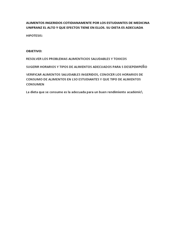 OBJETIVO: RESOLVER LOS PROBLEMAS ALIMENTICIOS SALUDABLES Y TOXICOS SUGERIR HORARIOS Y TIPOS DE ALIMENTOS ADECUADOS PARA S DESEPEMPEO VERIFICAR ALIMENTOS SALUDABLES INGERIDOS, CONOCER LOS HORARIOS DE CONSUMO DE ALIMENTOS EN LSO ESTUDIANTES Y QUE TIPO DE ALIMENTOS CONSUMEN La dieta que se consume es la adecuada para un buen rendimiento acadmic\