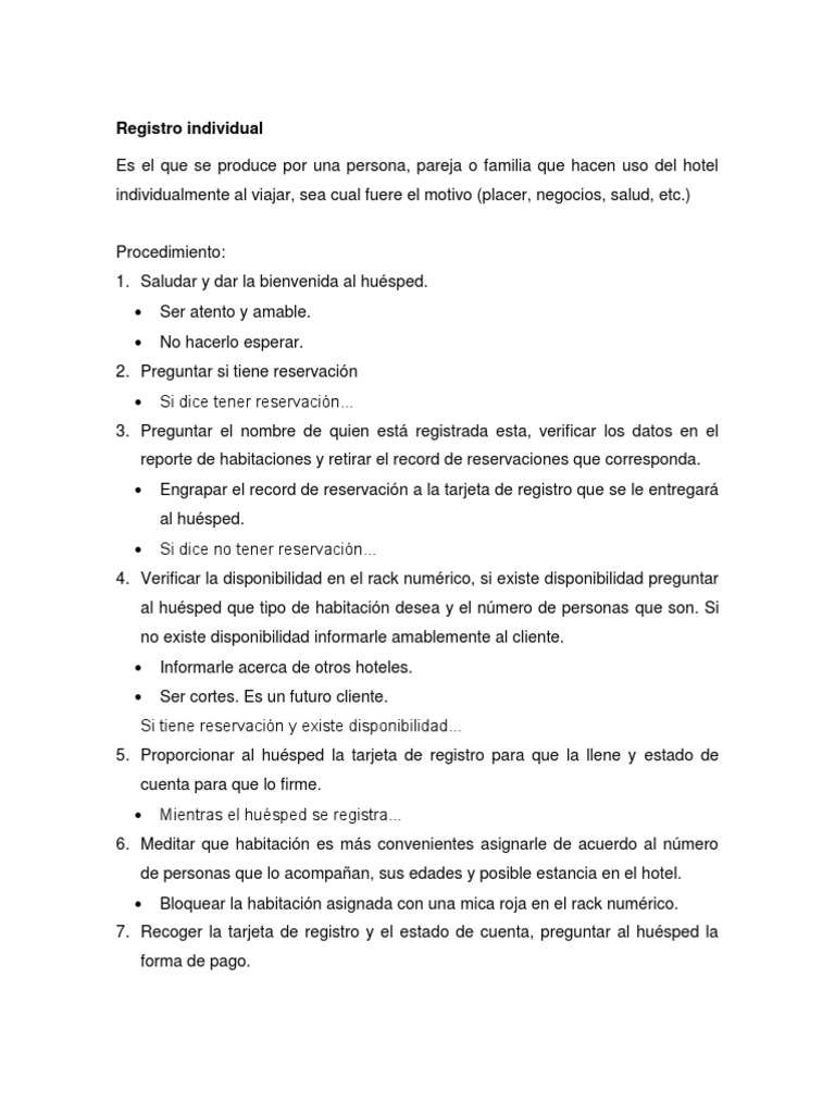 Procedimiento: 1. Saludar y dar la bienvenida al husped. Ser atento y amable. No hacerlo esperar. Si dice tener reservacin
