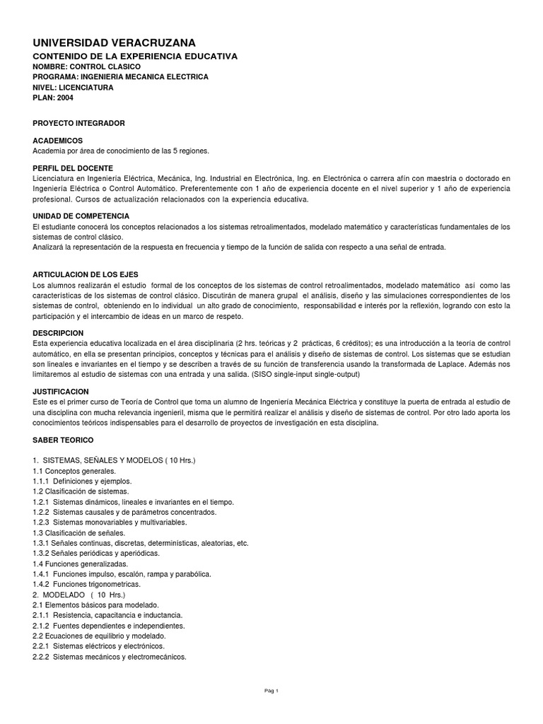 ARTICULACION DE LOS EJES Los alumnos realizarn el estudio formal de los conceptos de los sistemas de control retroalimentados, modelado matemtico as como las caractersticas de los sistemas de control clsico. Discutirn de manera grupal el anlisis, diseo y las simulaciones correspondientes de los sistemas de control, obteniendo en lo individual un alto grado de conocimiento, responsabilidad e inters por la reflexin, logrando con esto la participacin y el intercambio de ideas en un marco de respeto. DESCRIPCION Esta experiencia educativa localizada en el rea disciplinaria (2 hrs. tericas y 2 prcticas, 6 crditos); es una introduccin a la teora de control automtico, en ella se presentan principios, conceptos y tcnicas para el anlisis y diseo de sistemas de control. Los sistemas que se estudian son lineales e invariantes en el tiempo y se describen a travs de su funcin de transferencia usando la transformada de Laplace. Adems nos limitaremos al estudio de sistemas con una entrada y una salida. (SISO single-input single-output) JUSTIFICACION Este es el primer curso de Teora de Control que toma un alumno de Ingeniera Mecnica Elctrica y constituye la puerta de entrada al estudio de una disciplina con mucha relevancia ingenieril, misma que le permitir realizar el anlisis y diseo de sistemas de control. Por otro lado aporta los conocimientos tericos indispensables para el desarrollo de proyectos de investigacin en esta disciplina. SABER TEORICO 1. SISTEMAS, SEALES Y MODELOS ( 10 Hrs.) 1.1 Conceptos generales. 1.1.1 Definiciones y ejemplos. 1.2 Clasificacin de sistemas. 1.2.1 Sistemas dinmicos, lineales e invariantes en el tiempo. 1.2.2 Sistemas causales y de parmetros concentrados. 1.2.3 Sistemas monovariables y multivariables. 1.3 Clasificacin de seales. 1.3.1 Seales continuas, discretas, determinsticas, aleatorias, etc. 1.3.2 Seales peridicas y aperidicas. 1.4 Funciones generalizadas. 1.4.1 Funciones impulso, escaln, rampa y parablica. 1.4.2 Funciones trigonometricas. 2. MODELADO ( 10 Hrs.) 2.1 Elementos bsicos para modelado. 2.1.1 Resistencia, capacitancia e inductancia. 2.1.2 Fuentes dependientes e independientes. 2.2 Ecuaciones de equilibrio y modelado. 2.2.1 Sistemas elctricos y electrnicos. 2.2.2 Sistemas mecnicos y electromecnicos.