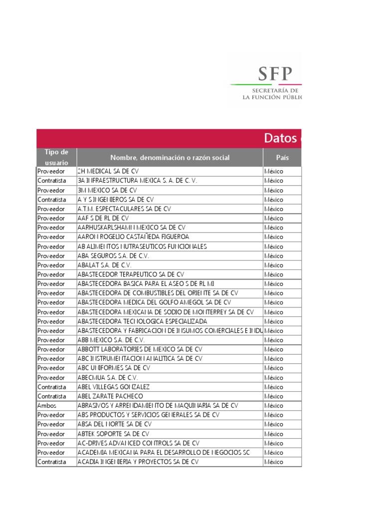 ASESORIA TURISTICA ACAMEX S DE RL DE CV Mxico ASESORIA Y PROVEEDORA DE EQUIPOS PARA LABORATORIO SA DE CV Mxico ASESORIA, CONSULTA E INGENIERIA GUTIERREZ GUERRERO SA DE CVMxico ASFALTOS Y AGREGADOS INDUSTRIALES SA DE CV Mxico ASFALTOS Y CONSTRUCCIONES SANCHEZ BONILLA SA DE CV Mxico ASFALTOS Y TERRACERIAS FEXLO SA DE CV Mxico ASGS SA DE CV Mxico ASISTENCIA INTEGRALES DE MEXICO SA DE CV Mxico ASKCO DE MEXICO SA Mxico ASMATLAB SA DE CV Mxico ASOCIACION DE CONSULTORES PARA LA INVESTIGACION EDUCATIVA Mxico ACIE AC ASOCIACION DE NORMALIZACION Y CERTIFICACION, A.C. Mxico ASOCIACION INTERNACIONAL DE PROVEEDORES SA DE CV Mxico ASOCIADOS CONSTRUCTORES URVIC SA DE CV Mxico ASPELAB DE MEXICO Mxico ASSIS TU VESTIR SA DE CV Mxico ASTROLLANTAS MEXICO SA DE CV Mxico ATENCION CORPORATIVA DE MEXICO SA DE CV Mxico ATYDE MEXICO, S.A. DE C.V. Mxico AUDELIA MENDOZA DIAS DE LEON Mxico AUDIO VIDEO INSTITUCIONAL Mxico AUSEL CAPITAINE VALENZUELA Mxico AUTO TODO MEXICANA SA DE CV Mxico AUTOANGAR SA DE CV Mxico AUTOBUSES ESTRELLA BLANCA SA DE CV Mxico AUTOMATIZACION Y CONECTIVIDAD SA DE CV Mxico AUTOMOTRIZ RANCAGUA SA DE CV Mxico AUTOMOTRIZ TABASCO SA DE CV Mxico AUTOMOTRIZ Y SERVICIO INTEGRAL SA DE CV Mxico AUTOMOTRIZ YUCATAN SA DE CV Mxico AUTOS DE HERMOSILLO SA DE CV Mxico AUTOS KINO SA DE CV Mxico AUTOSER ARAGON SA DE CV Mxico AUTOSERVICIO YUCATAN Mxico AUTOTEC DEL CENTRO SA DE CV Mxico AVANCES TECNOLOGICOS EN TELECOMUNICACIONES SA DE CV Mxico AVANTEL S DE RL DE CV Mxico AVICOM TECHNOLOGY Mxico AXA SEGUROS Mxico AXIA INMOBILIARIA Y CONSTRUCTORA SA DE CV Mxico AXIF DESARROLLO DE INGENIERIA, S.A. DE C.V. Mxico AXTEL S A B DE C V Mxico AYALA BARRITA CONSTRUCCIONES SA DE CV Mxico AYIX GRUPO CONSTRUCTOR SA DE CV Mxico AYMA INGENIERIA Y CONSULTORIA SA DE CV Mxico AZBER SUPERVISION Y CONSTRUCCION Mxico AZPROTEC SA DE CV Mxico