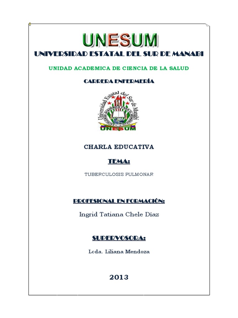 TEMAS: Tuberculosis Pulmonar RESPONSABLE: Ingrid Tatiana Chele Daz FECHA: lunes 21 de octubre del 2013 GRUPO QUE VA DIRIGIDO: Usuarios que asisten a la Maternidad Andrs de vera de Portoviejo. HORA: 9:00 DURACION: 15 minutos. LUGAR: Portoviejo Maternidad Andrs de Vera AREA: Maternidad TECNICA: Exposicin AYUDA AUDIOVISUAL: Rota folio. PRESENTACION: Buenos das seoras y seores SUPERVISORA: Lcda. Liliana Mendoza SALUDO: buenos das seores usuarios mi nombre es Tatiana Chele, estudiante de enfermera de la Universidad Estatal del Sur de Manab, en esta maana les voy a explicar sobre la Tuberculosis Pulmonar