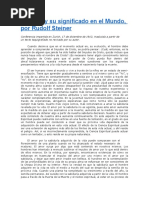No yo, sino Cristo en m, 25 de marzo de 1922. En tiempos remotos, el hombre senta a la naturaleza verde, y esta naturaleza estaba por doquier impregnada de alma y espritu rojo. En tiempos posteriores, el hombre senta la naturaleza, pero senta tambin la posibilidad de percibir, frente a la naturaleza ya sin alma, el propio "yo soy" amarillo. En aquel momento se necesitaba para ello la imagen del Dios que reside en el hombre, y lo senta en el dios Dionisio que le era presentado en el drama griego. En pocas an ms tarda el hombre sera nuevamente la naturaleza sin alma verde, y en s mismo el "yo soy" amarillo. Y all el drama se hace realidad. Sobre el Golgota se eleva la cruz. Pero al mismo tiempo se enciende en su interior lo que el hombre haba perdido originariamente, y brilla rojo desde su propio interior hacia afuera: No yo, sino Cristo en m.
