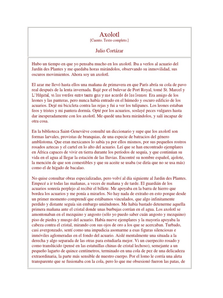 Hubo un tiempo en que yo pensaba mucho en los axolotl. Iba a verlos al acuario del Jardn des Plantes y me quedaba horas mirndolos, observando su inmovilidad, sus oscuros movimientos. Ahora soy un axolotl. El azar me llev hasta ellos una maana de primavera en que Pars abra su cola de pavo real despus de la lenta invernada. Baj por el bulevar de Port Royal, tom St. Marcel y LHpital, vi los verdes entre tanto gris y me acord de los leones. Era amigo de los leones y las panteras, pero nunca haba entrado en el hmedo y oscuro edificio de los acuarios. Dej mi bicicleta contra las rejas y fui a ver los tulipanes. Los leones estaban feos y tristes y mi pantera dorma. Opt por los acuarios, soslay peces vulgares hasta dar inesperadamente con los axolotl. Me qued una hora mirndolos, y sal incapaz de otra cosa. En la biblioteca Saint-Genevive consult un diccionario y supe que los axolotl son formas larvales, provistas de branquias, de una especie de batracios del gnero amblistoma. Que eran mexicanos lo saba ya por ellos mismos, por sus pequeos rostros rosados aztecas y el cartel en lo alto del acuario. Le que se han encontrado ejemplares en frica capaces de vivir en tierra durante los perodos de sequa, y que continan su vida en el agua al llegar la estacin de las lluvias. Encontr su nombre espaol, ajolote, la mencin de que son comestibles y que su aceite se usaba (se dira que no se usa ms) como el de hgado de bacalao. No quise consultar obras especializadas, pero volv al da siguiente al Jardin des Plantes. Empec a ir todas las maanas, a veces de maana y de tarde. El guardin de los acuarios sonrea perplejo al recibir el billete. Me apoyaba en la barra de hierro que bordea los acuarios y me pona a mirarlos. No hay nada de extrao en esto porque desde un primer momento comprend que estbamos vinculados, que algo infinitamente perdido y distante segua sin embargo unindonos. Me haba bastado detenerme aquella primera maana ante el cristal donde unas burbujas corran en el agua. Los axolotl se amontonaban en el mezquino y angosto (slo yo puedo saber cun angosto y mezquino) piso de piedra y musgo del acuario. Haba nueve ejemplares y la mayora apoyaba la cabeza contra el cristal, mirando con sus ojos de oro a los que se acercaban. Turbado, casi avergonzado, sent como una impudicia asomarme a esas figuras silenciosas e inmviles aglomeradas en el fondo del acuario. Aisl mentalmente una situada a la derecha y algo separada de las otras para estudiarla mejor. Vi un cuerpecito rosado y como translcido (pens en las estatuillas chinas de cristal lechoso), semejante a un pequeo lagarto de quince centmetros, terminado en una cola de pez de una delicadeza extraordinaria, la parte ms sensible de nuestro cuerpo. Por el lomo le corra una aleta transparente que se fusionaba con la cola, pero lo que me obsesion fueron las patas, de