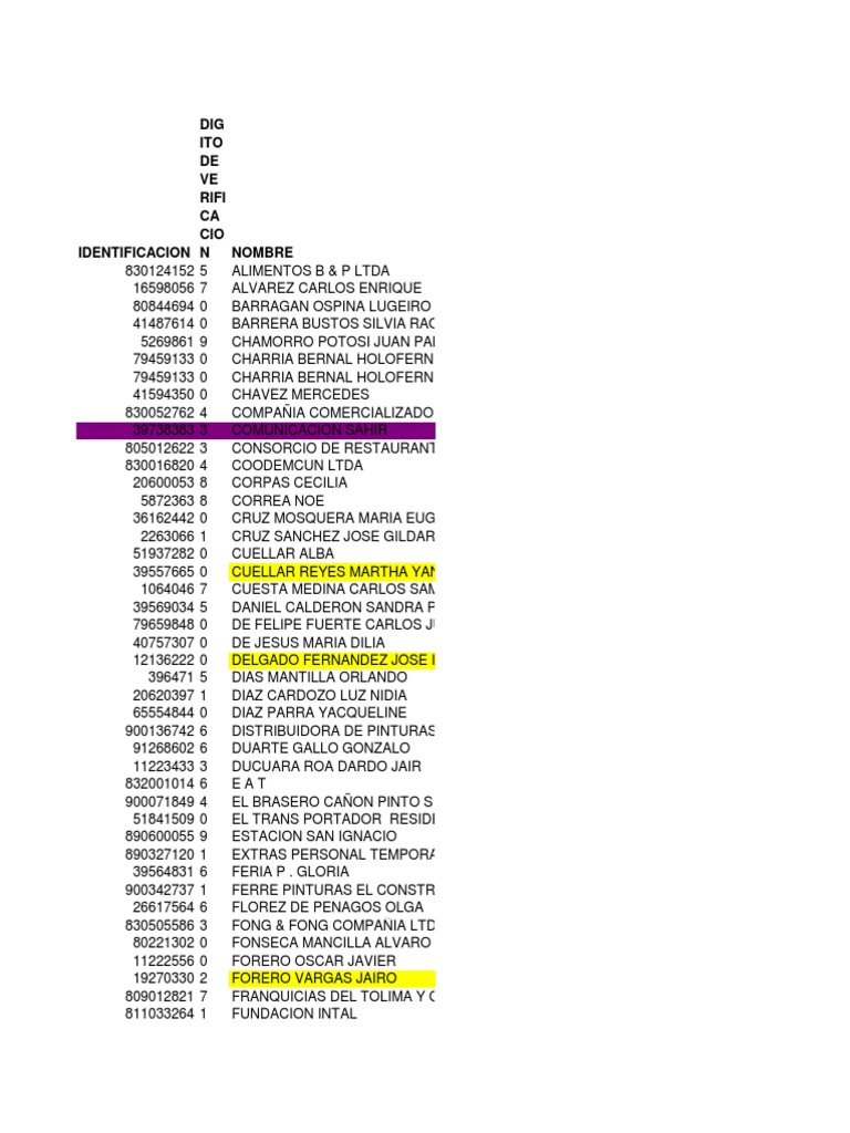 6 CRUZ GLORIA HERLINDA 0 CRUZ LUIS 0 CRUZ LUIS 0 CRUZ LUIS 0 CRUZ MOYA WALTER 0 CRUZ ORLANDO 7 CRUZ RAMIREZ PEDRO PABLO 7 CRUZ RIVERA ANGEL EDUARDO 0 CRUZ RODRIGUEZ DANIELA 79599648 CRUZ RUIZ JOSE 0 CRUZ SOACHA JORGE ARTURO 0 CUANTIAS MENORES 62114516 CUBILLOS LONDOO JULIAN 0 CUBILLOS A LUIS 6 CUBILLOS CALIXTO MAURICIO 0 CUBILLOS CASTILLO JOSE MILAN 0 CUBILLOS CASTILLO JOSE MILAN 0 CUBILLOS MARIA ALEJANDRA 7 CUBILLOS MIGUEL ANTONIO 2964796 CUCAITA AMAYA CIRO ALFONSO 0 CUCGUEN CHARRES ANTONIO MAIA 0 CUELLAR BELTRAN ELSA 0 CUELLAR DUARTE LEONOR 2 CUELLAR MARTHA 0 CUELLAR PEDRAZA GILBERTO 8 CUERVO ALDANA NUBIA YAZMIN 7 CUERVO SOLER LUIS ALBERTO 0 CUESTA LUIS JAVIER 4 CUESTA PATACON YASMIN 4 CUESTAS PATACON HECTOR HERBERTH 8 CUFIO CH. ODALINDA 1 CUMMINS DE LOS ANDES S.A. 0 CURREA AGUDELO DIEGO ALEJANDRO 860009694 CYRGO LTDA 1 D CLASE S.A. 9 D MARCAS Y EMPAQUES LTDA 0 D'ACHARDI LOZANO YENNY ZIOMARA 8 DALBERT INTERNACIONAL COLOMBIA SUCURSAL 6 DANARANJO S.A 6 DANCEL GIOVANNY 0 DANIEL JIMENEZ 7 DANIS HERNAN TORRES "DEPOSITO DE MATERIALES TORRES" 0 DARG LOZADA LUZ 4 DARIO MEJIA GIRALDO CACHARRERIA 2 DATA CONTROL S.A. 7 DAVIVIENDA 7 DAZA ALVAREZ MANUEL SALVADOR 0 DAZA ANGARITA HITLER ARCANGEL 0 DAZA BAQUERO ROSA JACKELINE 1 DAZA DE WALTEROS HILDA MARINA 0 DAZA LUIS ALBERTO 0 DAZA MARENTES MARIA