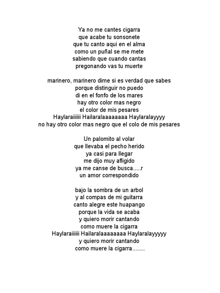 cantas pregonando vas tu muerte marinero, marinero dime si es verdad que sabes porque distinguir no puedo di en el fonfo de los mares hay otro color mas negro el color de mis pesares Haylaraiiiiii Hailaralaaaaaaaa Haylaralayyyy no hay otro color mas negro que el colo de mis pesares Un palomito al volar que llevaba el pecho herido ya casi para llegar me dijo muy afligido ya me canse de busca.....r un amor correspondido bajo la sombra de un arbol y al compas de mi guitarra canto alegre este huapango porque la vida se acaba y quiero morir cantando como muere la cigarra Haylaraiiiiii Hailaralaaaaaaaa Haylaralayyyyy y quiero morir cantando como muere la cigarra........