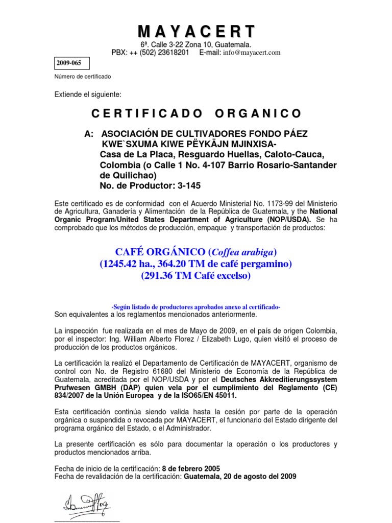 Certificado Orgánico Café Colombia