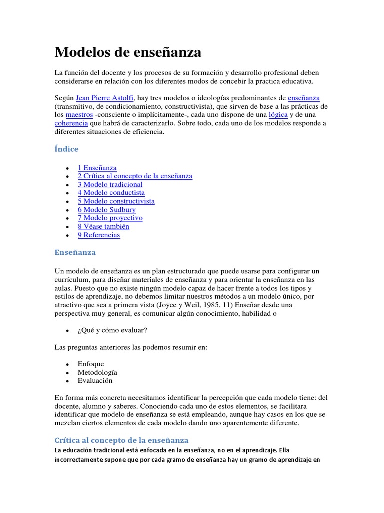 1 Enseanza 2 Crtica al concepto de la enseanza 3 Modelo tradicional 4 Modelo conductista 5 Modelo constructivista 6 Modelo Sudbury 7 Modelo proyectivo 8 Vase tambin 9 Referencias
