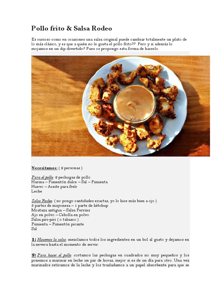 Necesitamos: ( 2 personas ) Para el pollo: 2 pechugas de pollo Harina Pimentn dulce Sal Pimienta Huevo Aceite para frer Leche Salsa Rodeo: ( no pongo cantidades exactas, yo lo hice ms bien a ojo ) 3 partes de mayonesa 1 parte de ktchup Mostaza antigua Salsa Perrins Ajo en polvo Cebolla en polvo Salsa piri-piri ( o tabasco ) Pimienta Pimentn picante Sal