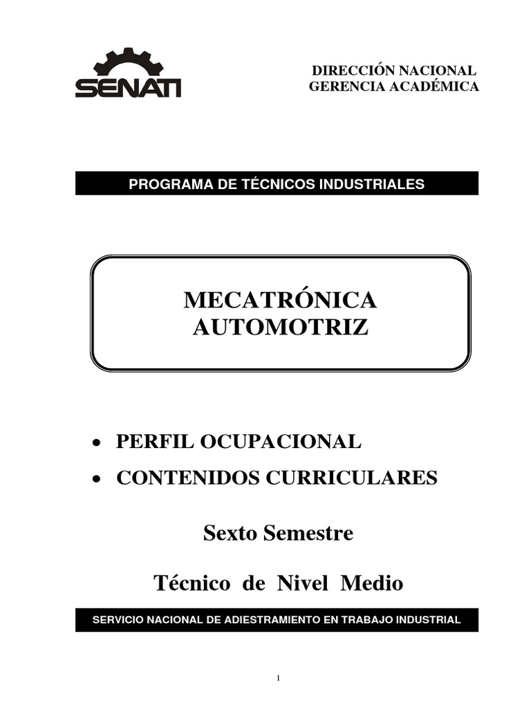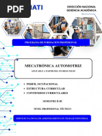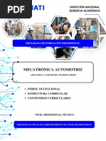 1. DESCRIPCIN El Tcnico en Mecatrnica Automotriz es un tcnico de nivel medio, con dominio de la especialidad. Tiene la competencia para conducir con autonoma, un puesto de trabajo en funcin de las exigencias tcnicas y de calidad del servicio en el ramo automotor. Diagnostica, efecta el mantenimiento preventivo, correctivo y predictivo de los sistemas mecnicos, hidrulicos, elctricos y electrnicos del vehiculo liviano, mediano y pesado, utilizando informacin tcnica especializada, instrumentos de diagnostico y control y aplicando las normas de seguridad y salud ocupacional y del cuidado ambiental. Tiene una formacin que le permite adaptarse a nuevas situaciones por la innovacin y avance tecnolgico. 2. COMPETENCIA PROFESIONAL El tcnico de nivel medio en Mecatrnica Automotriz esta en capacidad de realizar tareas y operaciones de diagnostico, mantenimiento preventivo y correctivo de los sistemas mecnico, hidrulico, elctrico y electrnico de vehculos motorizados, aplicando las especificaciones tcnicas del fabricante, las normas de calidad, seguridad y salud ocupacional y conservacin del medio ambiente. 2.1 Competencia Tcnica: Capacidad para organizar y ejecutar tareas y operaciones en procesos/ servicios aplicando normas y especificaciones tcnicas. Capacidad para aplicar conocimientos tecnolgicos y asimilar nuevos por cambios y avances en la tecnologa. Capacidad para interpretar y hacer uso del idioma ingles. Capacidad para hacer uso de software aplicado a la especialidad. Capacidad para trabajar con normas de calidad, seguridad y salud ocupacional y conservacin del medio ambiente.
