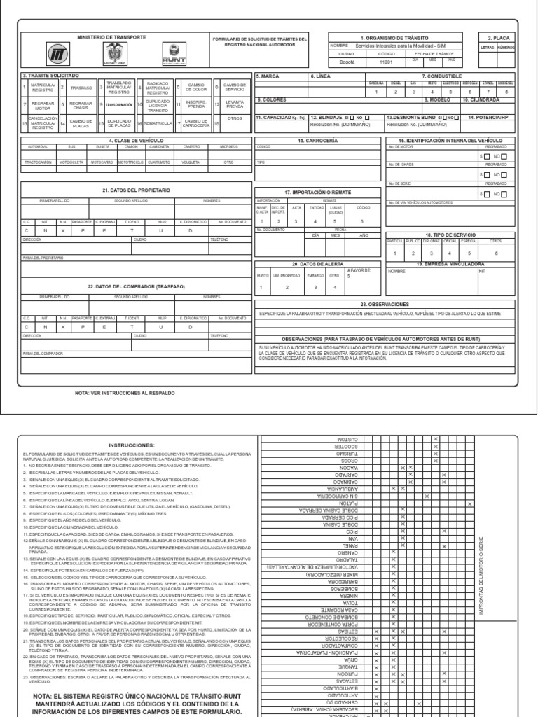 NOTA: EL SISTEMA REGISTRO NICO NACIONAL DE TRNSITO-RUNT MANTENDR ACTUALIZADO LOS CDIGOS Y EL CONTENIDO DE LA INFORMACIN DE LOS DIFERENTES CAMPOS DE ESTE FORMULARIO.