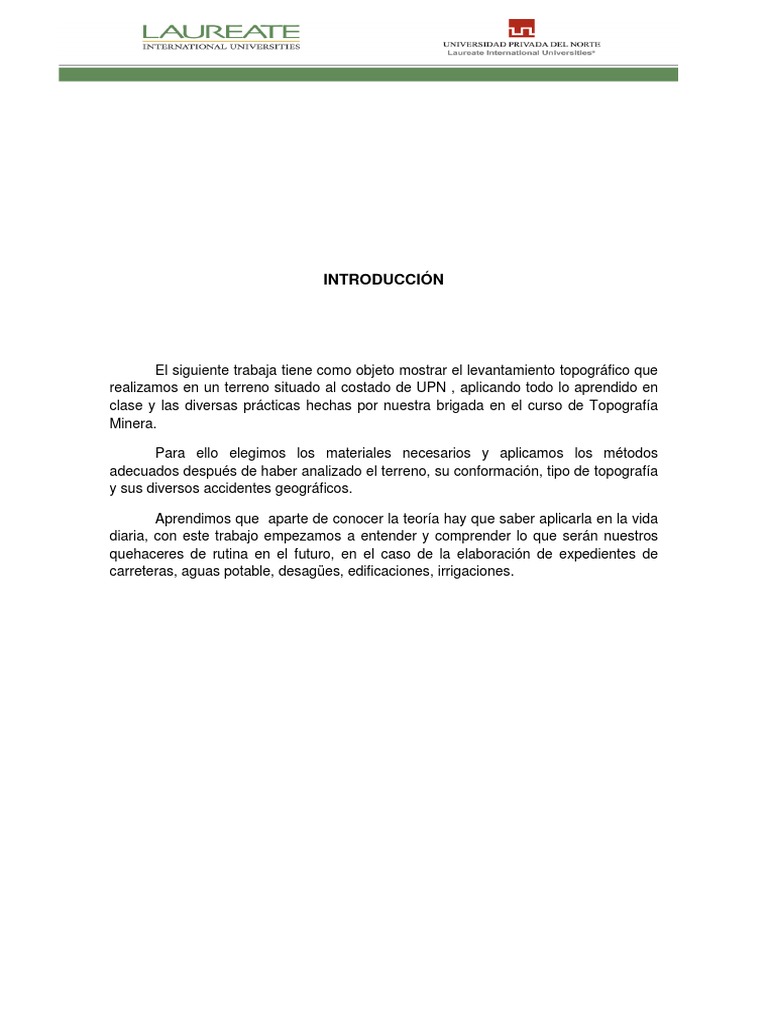 El siguiente trabaja tiene como objeto mostrar el levantamiento topogrfico que realizamos en un terreno situado al costado de UPN , aplicando todo lo aprendido en clase y las diversas prcticas hechas por nuestra brigada en el curso de Topografa Minera. Para ello elegimos los materiales necesarios y aplicamos los mtodos adecuados despus de haber analizado el terreno, su conformacin, tipo de topografa y sus diversos accidentes geogrficos. Aprendimos que aparte de conocer la teora hay que saber aplicarla en la vida diaria, con este trabajo empezamos a entender y comprender lo que sern nuestros quehaceres de rutina en el futuro, en el caso de la elaboracin de expedientes de carreteras, aguas potable, desages, edificaciones, irrigaciones.