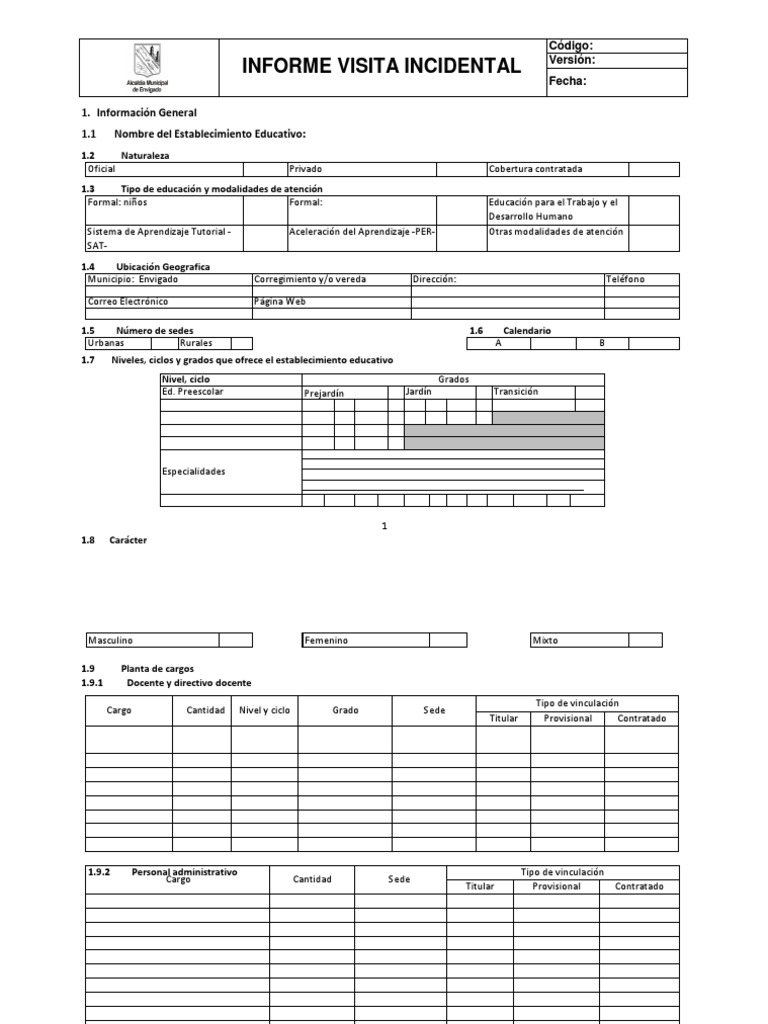 1.3 Tipo de educacin y modalidades de atencin Formal: nios Formal: Sistema de Aprendizaje Tutorial SAT1.4 Ubicacin Geografica Municipio: Envigado Correo Electrnico 1.5 Nmero de sedes Urbanas Rurales 1.7 Niveles, ciclos y grados que ofrece el establecimiento educativo Nivel, ciclo Ed. Preescolar Grados Prejardn Jardn Aceleracin del Aprendizaje -PER-