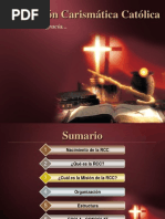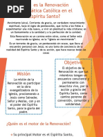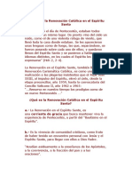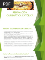 Curso: QU ES LA RENOVACIN? Objetivo: Descubrir qu es la Renovacin Carismtica Catlica en el Espritu Santo logrando tener una visin comn que ayude a cuidar la identidad del Movimiento. 1. INTRODUCCIN: Que as sea repetida en las familias cristianas el cuadro de los apstoles reunidos en Jerusaln despus de la ascensin de Jess al cielo cuando la Iglesia recin nacida estaba unnime en comunin de pensamiento y oracin con Pedro y alrededor de Pedro, el pastor de los corderos y de las ovejas; y que el Espritu Divino se digne en contestar de la manera ms consoladora la oracin que diariamente a El asciende de todos los rincones de la tierra: renueva en nuestros tiempos tus maravillas como un Nuevo Pentecosts y concede que la Santa Iglesia, manteniendo unnime una oracin continua, con MARA, la madre de Jess, y bajo la direccin de San Pedro, aumente el reino del divino Salvador, el reino de verdad y de justicia, de amor y de paz, amn. S.S. JUAN XXIII (HUMANAE SALUTIS). Estamos viviendo un renacer de la Iglesia, la Renovacin Catlica Carismtica es una de las tantas bendiciones dadas por Dios en respuesta a la oracin del Papa Juan XXIII; y es el Espritu Santo el principal motor, el cual da sus dones, sus frutos, etc. pero los da para extender el reino de Dios, para edificar la Iglesia. Ser renovados y no conocer la Renovacin no es congruente, no podemos vivir una renovacin mediocre, sino mas bien debemos saber dar razn de nuestra fe, como nos invita la Palabra de Dios en la 1 Pd. 3,15 Estn siempre prontos a dar razn de vuestra esperanza... no podemos quedarnos enanos en nuestra fe, debemos saber dar razones de lo que vivimos.