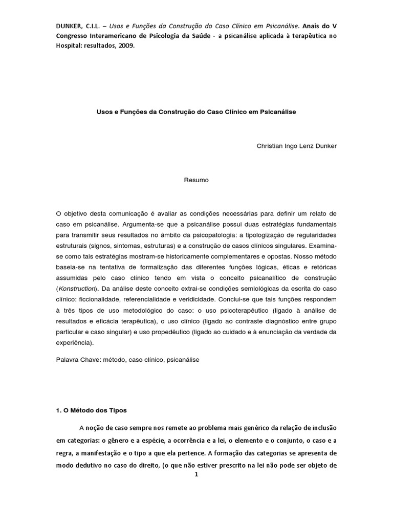 O objetivo desta comunicao avaliar as condies necessrias para definir um relato de caso em psicanlise. Argumenta-se que a psicanlise possui duas estratgias fundamentais para transmitir seus resultados no mbito da psicopatologia: a tipologizao de regularidades estruturais (signos, sintomas, estruturas) e a construo de casos clnicos singulares. Examinase como tais estratgias mostram-se historicamente complementares e opostas. Nosso mtodo baseia-se na tentativa de formalizao das diferentes funes lgicas, ticas e retricas assumidas pelo caso clnico tendo em vista o conceito psicanaltico de construo (Konstruction). Da anlise deste conceito extrai-se condies semiolgicas da escrita do caso clnico: ficcionalidade, referencialidade e veridicidade. Conclui-se que tais funes respondem trs tipos de uso metodolgico do caso: o uso psicoteraputico (ligado anlise de resultados e eficcia teraputica), o uso clnico (ligado ao contraste diagnstico entre grupo particular e caso singular) e uso propedutico (ligado ao cuidado e enunciao da verdade da experincia). Palavra Chave: mtodo, caso clnico, psicanlise