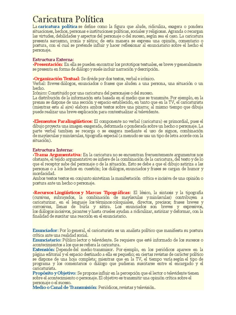 La caricatura poltica se define como la figura que alude, ridiculiza, exagera o pondera situaciones, hechos, personas e instituciones polticas, sociales y religiosas. Agranda o recargan las virtudes, debilidades y aspectos del personaje o del suceso, segn sea el caso. La caricatura presenta sarcasmo, irona y stira; de esta manera se expresa una opinin, comentario o postura, con el cual se pretende influir y hacer reflexionar al enunciatario sobre el hecho el personaje. Estructura Externa: Presentacin: En ella se pueden encontrar los prototipos textuales, es breve y generalmente se presenta en forma de dilogo y suele incluir narracin y descripcin. Organizacin Textual: Se divide por dos textos, verbal e icnico. Verbal: Breves dilogos, enunciados o frases que aluden a una persona, una situacin o un hecho. Icnico: Constituido por una caricatura del personajes o del suceso. La distribucin de la informacin esta basada en el medio que se transmite. Por ejemplo, en la prensa se dispone de una seccin y espacio establecido, en tanto que en la TV, el caricaturista (mientras esta al aire) elabora ambos textos sobre una pizarra; al mismo tiempo que dibuja puede realizar una breve explicacin para contextualizar al televidente. Elementos Paralingsticos: El componente no verbal (caricatura) es primordial, pues el dibujo proyecta una imagen exagerada, deformada o ponderada sobre un hecho o personaje. La parte verbal tambien se recarga o se exagera mediante el uso de signos, combinacin de maysculas y minsculas, tipografa especial (a menudo se usa un tipo de letra acorde con la situacin). Estructura Interna: Trama Argumentativa: En la caricatura no se encuentran frecuentemente argumentos nos obstante, el tejido argumentativo se infiere de la combinacin de la caricatura, del texto y de lo que el receptor sabe del personaje o de la situacin. Esto se debe a que el dibujo satiriza a las personas o a los hechos en cuestin; los dilogos, enunciados y frases se cargan de humor y mordacidad. Ambos textos textos en conjunto sintetizan la manifestacin crtica e incisiva de una opinin o postura ante un hecho o personaje. Recursos Lingsticos y Marcas Tipogrficas: El lxico, la sintaxis y la tipografa (cursivas, subrayados, la combinacin de maysculas y minsculas) contribuyen a caricaturizar. en el lenguaje los trminos coloquiales, directos, precisos; frases breves y corrosivas, llenas de burla y stira. Los enunciados son breves y expresivos, los dilogos incisivos, picantes y hasta crueles ayudan a ridiculizar, satirizar y deformar, con la finalidad de suscitar una reaccin en el enunciatario. Enunciador: Por lo general, el caricaturista es un analista poltico que manifiesta su postura crtica ante una realidad social. Enunciatario: Pblico lector o televidente. Se requiere que est informado de los sucesos o acontecimientos a los que se refiera la caricatura. Extensin: Depende del medio transmisor. Por ejemplo, en los peridicos aparece en la pgina editorial y el espacio destinado a ella es pequeo; en ciertas revistas de carcter poltico se dispone de una hoja completa; mientras que en la TV, el tiempo vara segn el tipo de programa y los comentarios o dilogo que pudieran suscitarse entre el encargado y el caricaturista. Propsito y Objetivo: Se propone influir en la percepcin que el lector o televidente tienen sobre el acontecimiento o personaje. El objetivo es transmitir una opinin crtica sobre el personaje o el suceso. Medio o Canal de Transmisin: Peridicos, revistas y televisin.