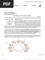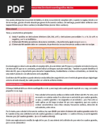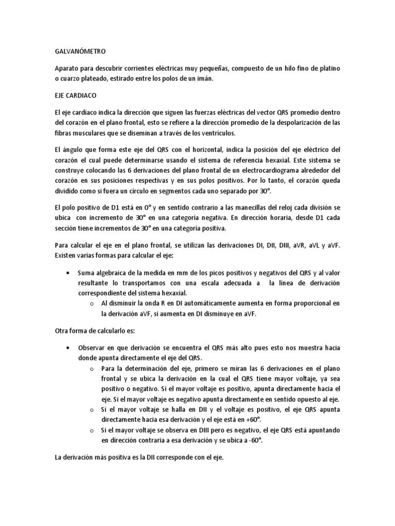 entre los polos de un imn. EJE CARDIACO El eje cardiaco indica la direccin que siguen las fuerzas elctricas del vector QRS promedio dentro del corazn en el plano frontal, esto se refiere a la direccin promedio de la despolarizacin de las fibras musculares que se diseminan a travs de los ventrculos. El ngulo que forma este eje del QRS con el horizontal, indica la posicin del eje elctrico del corazn el cual puede determinarse usando el sistema de referencia hexaxial. Este sistema se construye colocando las 6 derivaciones del plano frontal de un electrocardiograma alrededor del corazn en sus posiciones respectivas y en sus polos positivos. Por lo tanto, el corazn queda dividido como si fuera un crculo en segmentos cada uno separado por 30. El polo positivo de D1 est en 0 y en sentido contrario a las manecillas del reloj cada divisin se ubica con incremento de 30 en una categora negativa. En direccin horaria, desde D1 cada seccin tiene incrementos de 30 en una categora positiva. Para calcular el eje en el plano frontal, se utilizan las derivaciones DI, DII, DIII, aVR, aVL y aVF. Existen varias formas para calcular el eje: Suma algebraica de la medida en mm de los picos positivos y negativos del QRS y al valor resultante lo transportamos con una escala adecuada a la lnea de derivacin correspondiente del sistema hexaxial. o Al disminuir la onda R en DI automticamente aumenta en forma proporcional en la derivacin aVF, si aumenta en DI disminuye en aVF.