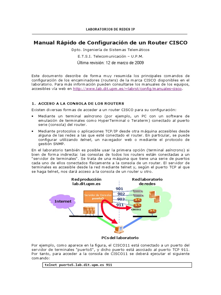 1. ACCESO A LA CONSOLA DE LOS ROUTERS Existen diversas formas de acceder a un router CISCO para su configuracin: Mediante un terminal asncrono (por ejemplo, un PC con un software de emulacin de terminales como HyperTerminal o Teraterm) conectado al puerto serie (consola) del router. Mediante protocolos o aplicaciones TCP/IP desde otra mquina accesibles desde alguna de las redes a las que est conectado el router. En particular, se puede configurar utilizando telnet, un navegador web o mediante el protocolo de gestin SNMP.