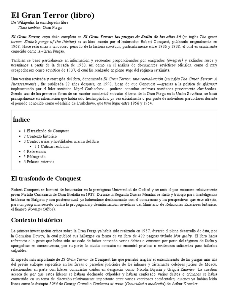 De Wikipedia, la enciclopedia libre Vase tambin: Gran Purga El Gran Terror, cuyo ttulo completo es El Gran Terror: las purgas de Stalin de los aos 30 (en ingls The great terror: Stalin's purge of the thirties) es un libro escrito por el historiador Robert Conquest, publicado originalmente en 1968. Hace referencia a un oscuro perodo de la historia sovitica, particularmente entre 1936 y 1938, el cual es usualmente conocido como la Gran Purga. Tambin se bas parcialmente en informacin y recuentos proporcionados por emigrados (migrs) y exiliados rusos y ucranianos a partir de la dcada de 1930, as como en el anlisis de documentos soviticos oficiales, como el muy sospechoso censo sovitico de 1937, el cual fue realizado en pleno auge del rgimen estalinista. Una versin revisada y corregida del libro, denominada El Gran Terror: una reevaluacin (en ingls The Great Terror: A Reassessment ) , fue publicada 22 aos despus, en 1990, luego de que Conquest gracias a la poltica de glsnost implementada por el lder sovitico Mijal Gorbachov pudiese consultar archivos soviticos previamente clasificados. Siendo uno de los primeros libros de un escritor occidental en tratar el tema de la Gran Purga en la Unin Sovitica, se bas principalmente en informacin que haba sido hecha pblica, ya sea oficialmente o por parte de individuos particulares durante el perodo conocido como deshielo de Jrushchov, que tuvo lugar entre 1956 y 1964.