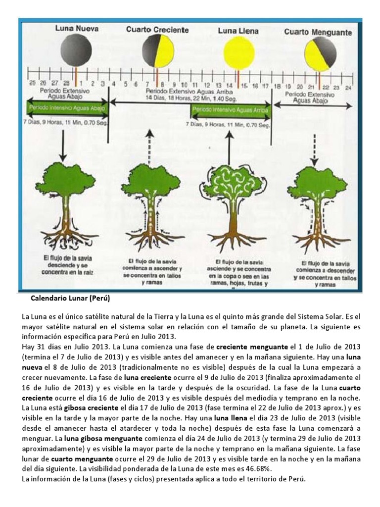 Es el mayor satlite natural en el sistema solar en relacin con el tamao de su planeta. La siguiente es informacin especfica para Per en Julio 2013. Hay 31 das en Julio 2013. La Luna comienza una fase de creciente menguante el 1 de Julio de 2013 (termina el 7 de Julio de 2013) y es visible antes del amanecer y en la maana siguiente. Hay una luna nueva el 8 de Julio de 2013 (tradicionalmente no es visible) despus de la cual la Luna empezar a crecer nuevamente. La fase de luna creciente ocurre el 9 de Julio de 2013 (finaliza aproximadamente el 16 de Julio de 2013) y es visible en la tarde y despus de la oscuridad. La fase de la Luna cuarto creciente ocurre el da 16 de Julio de 2013 y es visible despus del medioda y temprano en la noche. La Luna est gibosa creciente el da 17 de Julio de 2013 (fase termina el 22 de Julio de 2013 aprox.) y es visible en la tarde y la mayor parte de la noche. Hay una luna llena el da 23 de Julio de 2013 (visible desde el amanecer hasta el atardecer y toda la noche) despus de esta fase la Luna comenzar a menguar. La luna gibosa menguante comienza el da 24 de Julio de 2013 (y termina 29 de Julio de 2013 aproximadamente) y es visible la mayor parte de la noche y temprano en la maana siguiente. La fase lunar de cuarto menguante ocurre el 29 de Julio de 2013 y es visible tarde en la noche y en la maana del da siguiente. La visibilidad ponderada de la Luna de este mes es 46.68%. La informacin de la Luna (fases y ciclos) presentada aplica a todo el territorio de Per.
