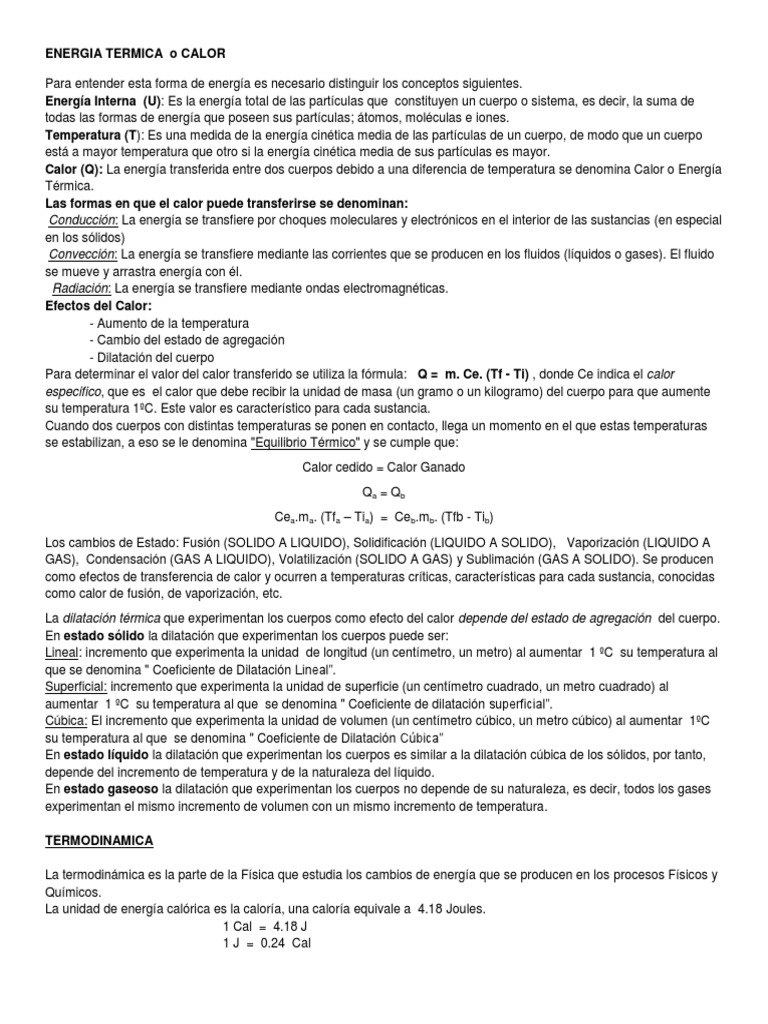 Energa Interna (U): Es la energa total de las partculas que constituyen un cuerpo o sistema, es decir, la suma de todas las formas de energa que poseen sus partculas; tomos, molculas e iones. Temperatura (T): Es una medida de la energa cintica media de las partculas de un cuerpo, de modo que un cuerpo est a mayor temperatura que otro si la energa cintica media de sus partculas es mayor. Calor (Q): La energa transferida entre dos cuerpos debido a una diferencia de temperatura se denomina Calor o Energa Trmica. Las formas en que el calor puede transferirse se denominan: Conduccin: La energa se transfiere por choques moleculares y electrnicos en el interior de las sustancias (en especial en los slidos) Conveccin: La energa se transfiere mediante las corrientes que se producen en los fluidos (lquidos o gases). El fluido se mueve y arrastra energa con l. Radiacin: La energa se transfiere mediante ondas electromagnticas. Efectos del Calor: - Aumento de la temperatura - Cambio del estado de agregacin - Dilatacin del cuerpo Para determinar el valor del calor transferido se utiliza la frmula: Q = m. Ce. (Tf - Ti) , donde Ce indica el calor especifico, que es el calor que debe recibir la unidad de masa (un gramo o un kilogramo) del cuerpo para que aumente su temperatura 1C. Este valor es caracterstico para cada sustancia. Cuando dos cuerpos con distintas temperaturas se ponen en contacto, llega un momento en el que estas temperaturas se estabilizan, a eso se le denomina "Equilibrio Trmico" y se cumple que: Calor cedido = Calor Ganado Qa = Qb Cea.ma. (Tfa Tia) = Ceb.mb. (Tfb - Tib) Los cambios de Estado: Fusin (SOLIDO A LIQUIDO), Solidificacin (LIQUIDO A SOLIDO), Vaporizacin (LIQUIDO A GAS), Condensacin (GAS A LIQUIDO), Volatilizacin (SOLIDO A GAS) y Sublimacin (GAS A SOLIDO). Se producen como efectos de transferencia de calor y ocurren a temperaturas crticas, caractersticas para cada sustancia, conocidas como calor de fusin, de vaporizacin, etc. La dilatacin trmica que experimentan los cuerpos como efecto del calor depende del estado de agregacin del cuerpo. En estado slido la dilatacin que experimentan los cuerpos puede ser: Lineal: incremento que experimenta la unidad de longitud (un centmetro, un metro) al aumentar 1 C su temperatura al que se denomina " Coeficiente de Dilatacin Lineal. Superficial: incremento que experimenta la unidad de superficie (un centmetro cuadrado, un metro cuadrado) al aumentar 1 C su temperatura al que se denomina " Coeficiente de dilatacin superficial. Cbica: El incremento que experimenta la unidad de volumen (un centmetro cbico, un metro cbico) al aumentar 1C su temperatura al que se denomina " Coeficiente de Dilatacin Cbica En estado lquido la dilatacin que experimentan los cuerpos es similar a la dilatacin cbica de los slidos, por tanto, depende del incremento de temperatura y de la naturaleza del lquido. En estado gaseoso la dilatacin que experimentan los cuerpos no depende de su naturaleza, es decir, todos los gases experimentan el mismo incremento de volumen con un mismo incremento de temperatura. TERMODINAMICA La termodinmica es la parte de la Fsica que estudia los cambios de energa que se producen en los procesos Fsicos y Qumicos. La unidad de energa calrica es la calora, una calora equivale a 4.18 Joules. 1 Cal = 4.18 J 1 J = 0.24 Cal