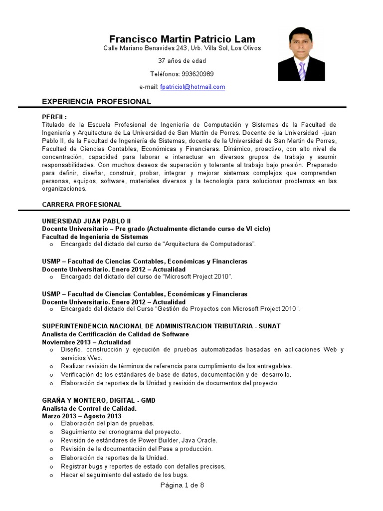PERFIL: Ti'+lado de la ,s(+ela -rofesional de .n/enier0a de Co%&+'a(i1n 2 Sis'e%as de la 3a(+l'ad de .n/enier0a 2 4r5+i'e('+ra de La Universidad de San Mar'0n de -orres. 6o(en'e de la Universidad $7+an -ablo .., de la 3a(+l'ad de .n/enier0a de Sis'e%as, do(en'e de la Universidad de San Mar'in de -orres, 3a(+l'ad de Cien(ias Con'ables, ,(on1%i(as 2 3inan(ieras. 6in8%i(o, &roa('ivo, (on al'o nivel de (on(en'ra(i1n, (a&a(idad &ara laborar e in'era('+ar en diversos /r+&os de 'raba7o 2 as+%ir res&onsabilidades. Con %+(*os deseos de s+&era(i1n 2 'oleran'e al 'raba7o ba7o &resi1n. Pre&arado &ara definir, disear, (ons'r+ir, &robar, in'e/rar 2 %e7orar sis'e%as (o%&le7os 5+e (o%&renden &ersonas, e5+i&os, sof'9are, %a'eriales diversos 2 la 'e(nolo/0a &ara sol+(ionar &roble%as en las or/ani:a(iones. CARRERA PROFESIONAL UNIERSIDAD JUAN PABLO II Docente Universitario Pre ra!o "Act#a$mente !ictan!o c#rso !e %I cic$o& Fac#$ta! !e In enier'a !e Sistemas o ,n(ar/ado del di('ado del (+rso de ;4r5+i'e('+ra de Co%&+'adoras<. USMP Fac#$ta! !e Ciencias Conta($es) Econ*micas + Financieras Docente Universitario, Enero -./- Act#a$i!a! o ,n(ar/ado del di('ado del (+rso de ;Mi(rosof' -ro7e(' 2"="<. USMP Fac#$ta! !e Ciencias Conta($es) Econ*micas + Financieras Docente Universitario, Enero -./- Act#a$i!a! o ,n(ar/ado del di('ado del C+rso ;>es'i1n de -ro2e('os (on Mi(rosof' -ro7e(' 2"="<. SUPERIN0ENDENCIA NACIONAL DE ADMINIS0RACION 0RIBU0ARIA 1 SUNA0 Ana$ista !e Certi2icaci*n !e Ca$i!a! !e So2t3are Noviem(re -./4 Act#a$i!a! o 6iseo, (ons'r+((i1n 2 e7e(+(i1n de &r+ebas a+'o%a'i:adas basadas en a&li(a(iones ?eb 2 servi(ios ?eb. o @eali:ar revisi1n de 'r%inos de referen(ia &ara (+%&li%ien'o de los en're/ables. o Verifi(a(i1n de los es'8ndares de base de da'os, do(+%en'a(i1n 2 de desarrollo. o ,labora(i1n de re&or'es de la Unidad 2 revisi1n de do(+%en'os del &ro2e('o. 5RA6A 7 MON0ERO) DI5I0AL 1 5MD Ana$ista !e Contro$ !e Ca$i!a!, Mar8o -./4 A osto -./4 o ,labora(i1n del &lan de &r+ebas. o Se/+i%ien'o del (rono/ra%a del &ro2e('o. o @evisi1n de es'8ndares de -o9er B+ilder, Aava Ora(le. o @evisi1n de la do(+%en'a(i1n del -ase a &rod+((i1n. o ,labora(i1n de re&or'es de la Unidad. o @e/is'rar b+/s 2 re&or'es de es'ado (on de'alles &re(isos. o Ba(er el se/+i%ien'o del es'ado de los b+/s.