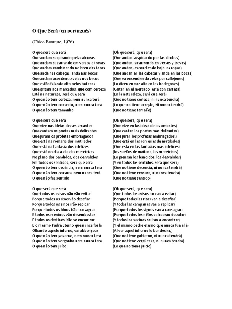 O que ser que ser Que andam suspirando pelas alcovas Que andam sussurando em versos e trovas Que andam combinando no breu das tocas Que anda nas cabeas, anda nas bocas Que andam acendendo velas nos becos Que esto falando alto pelos botecos Que gritam nos mercados, que com certeza Est na natureza, ser que ser O que no tem certeza, nem nunca ter O que no tem conserto, nem nunca ter O que no tem tamanho O que ser que ser Que vive nas idias desses amantes Que cantam os poetas mais delirantes Que juram os profetas embriagados Que est na romaria dos mutilados Que est na fantasia dos infelizes Que est no dia-a-dia das meretrizes No plano dos bandidos, dos desvalidos Em todos os sentidos, ser que ser O que no tem decncia, nem nunca ter O que no tem censura, nem nunca ter O que no faz sentido O que ser que ser Que todos os avisos no vo evitar Porque todos os risos vo desafiar Porque todos os sinos iro repicar Porque todos os hinos iro consagrar E todos os meninos vo desembestar E todos os destinos iro se encontrar E o mesmo Padre Eterno que nunca foi l Olhando aquele inferno, vai abbenoar O que no tem governo, nem nunca ter O que no tem vergonha nem nunca ter O que no tem juzo (Oh que ser, que ser) (Que andan suspirando por las alcobas) (Que andan, susurrando en versos y trovas) (Que andan, escondiendo bajo las ropas) (Que andan en las cabezas y anda en las bocas) (Que va encendiendo velas por callejones) (Lo dicen en voz alta en los bodegones) (Gritan en el mercado, est con certeza) (En la naturaleza, ser que ser) (Que no tiene certeza, ni nunca tendr) (Lo que no tiene arreglo, Ni nunca tendr) (Que no tiene tamao) (Oh que ser, que ser) (Que vive en las ideas de los amantes) (Que cantan los poetas mas delirantes) (Que juran los profetas embriagados,) (Que est en las romeras de mutilados) (Que est en las fantasas mas infelices) (los sueos de maana, las meretrices) (Lo piensan los bandidos, los desvalidos) (Y en todos los sentidos, ser que ser) (Que no tiene decencia, ni nunca tendr) (Que no tiene censura, ni nunca tendr) (Que no tiene sentido) (Oh que ser, que ser) (Que todos los avisos no van a evitar) (Porque todas las risas van a desafiar) (Y todas las campanas van a replicar) (Porque todos los signos van a consagrar) (Porque todos los nios se habrn de zafar) (Y todos los vecinos se irn a encontrar) (Y el mismo padre eterno que nunca fue all) (Al ver aquel infierno lo bendecir,) (Que no tiene gobierno, ni nunca tendr) (Que no tiene vergenza, ni nunca tendr) (Lo que no tiene juicio)