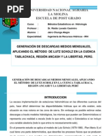 Para la generacin de caudales mensuales medios en cuencas sin registros hidromtricos usamos el modelo de Lutz Scholz, para ello consideramos la precipitacin total mensual en mm, el rea de la cuenca en estudio en km2 , la retencin de la cuenca R en mm, denida como la lmina de la lluvia retenida por la cuenca y que contribuye al abastecimiento de agua en la poca de estiaje. Esta lmina se ha calculado a partir de los acuferos potenciales como las lagunas y los nevados que de acuerdo a la pendiente de la cuenca retiene una determinada lmina de agua. El coeciente de agotamiento a se obtiene a partir de la frmula emprica de Moss, como una funcin del rea de la cuenca A e interviene en el clculo de los caudales en poca de estiaje, a = 0.00252 ln(A) + 0.030 . (4)